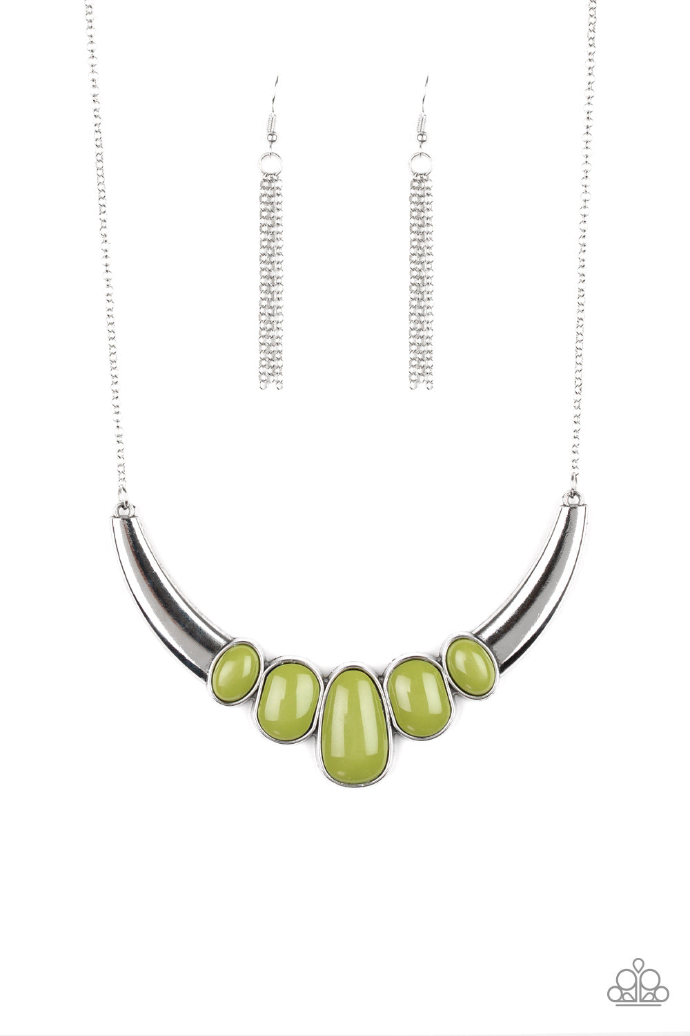 Gradually increasing in size at the center, a collection of abstract green beads are pressed into a shimmery half-moon frame, creating a colorful statement piece below the collar. Features an adjustable clasp closure.