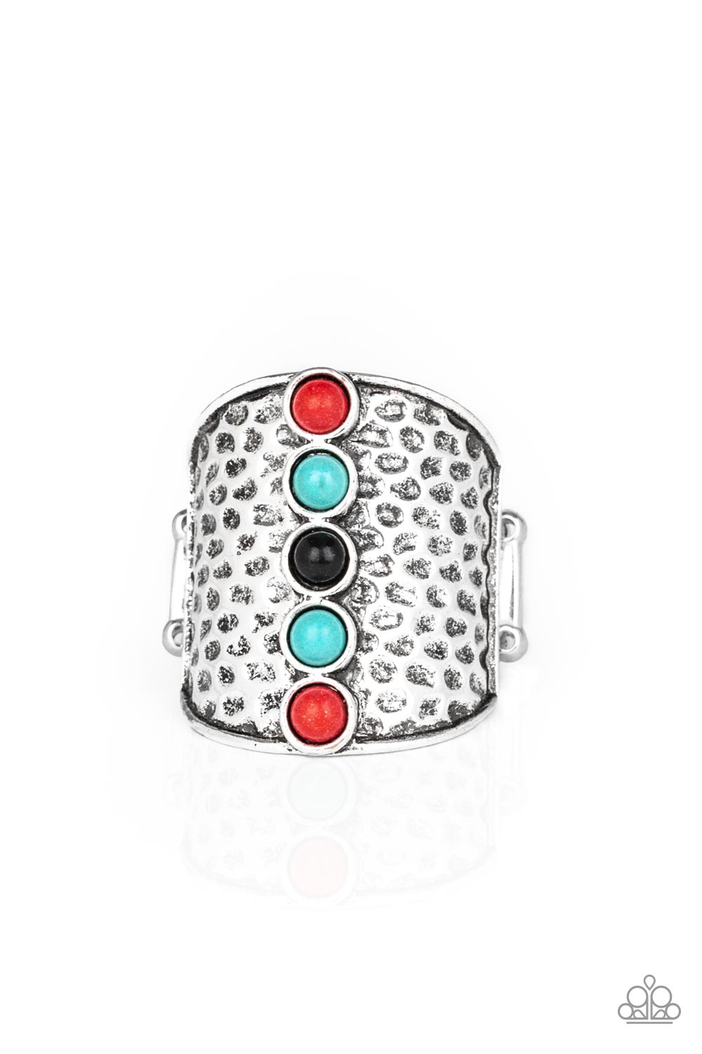 A row of dainty red, black, and turquoise stones are stacked vertically down the center of a hammered silver frame for a seasonal flair. Features a stretchy band for a flexible fit.