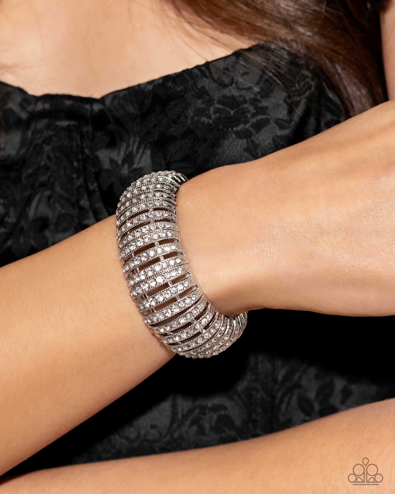 Featuring glistening white gems, trios of curved silver bars join high-sheen curved silver bars for a radiant, light-catching display around the wrist on elastic stretchy bands.