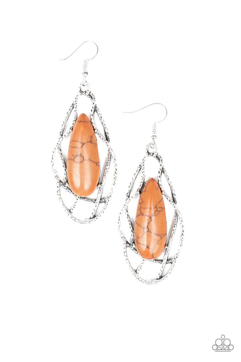 Chiseled into a tranquil teardrop, an earthy brown stone is pressed into a shimmery silver wire backdrop for an artisan inspired look. Earring attaches to a standard fishhook fitting.