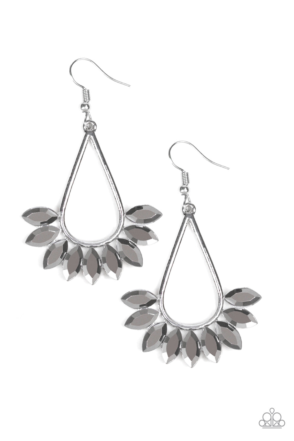 Marquise cut hematite rhinestones fan from the bottom of an antiqued silver teardrop, creating an edgy fringe. Earring attaches to a standard fishhook fitting.