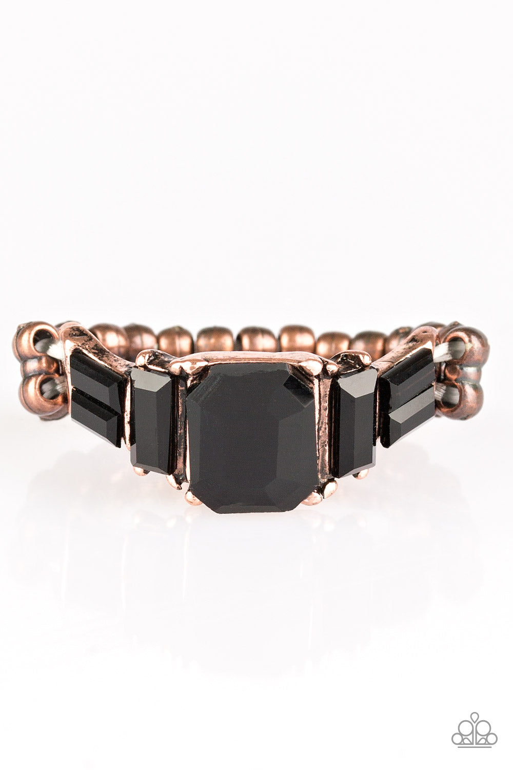 Varying in cut and shimmer, glittery black rhinestones stack into a glamorous band across the finger. Features a dainty stretchy band for a flexible fit.