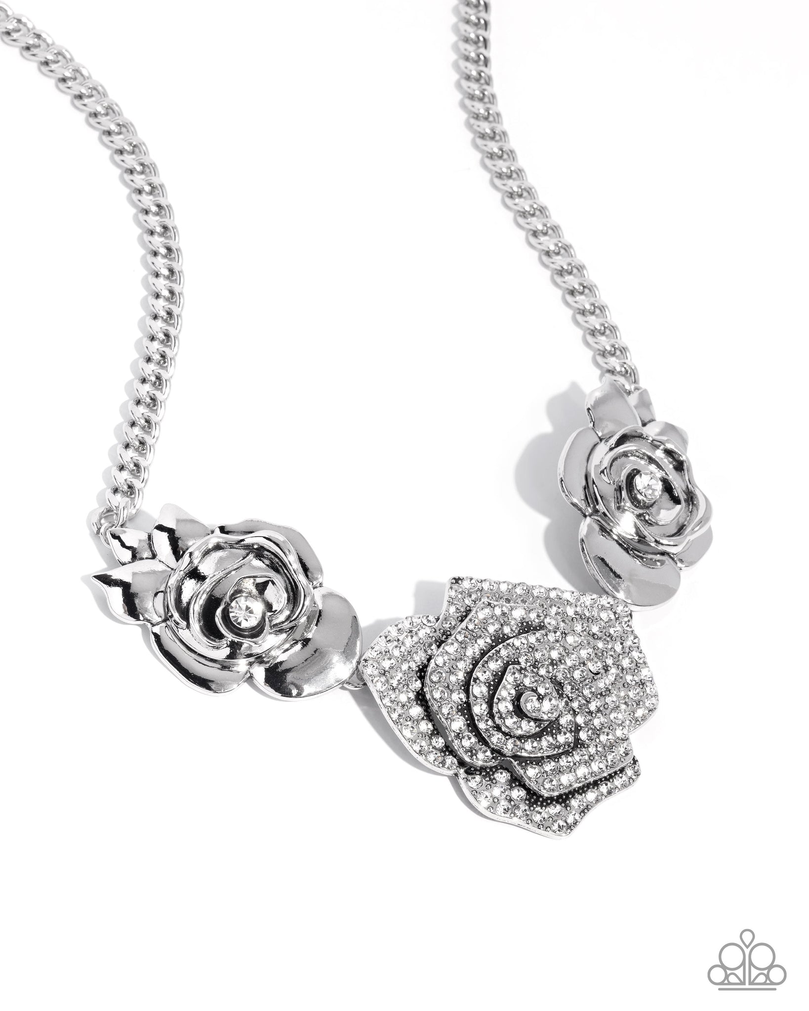Connecting to a high-sheen silver curb chain, white rhinestone-centered three-dimensional blooming silver roses frame a white rhinestone-dusted flattened three-dimensional flower for a whimsically adorable arrangement below the neckline. Features an adjustable clasp closure.