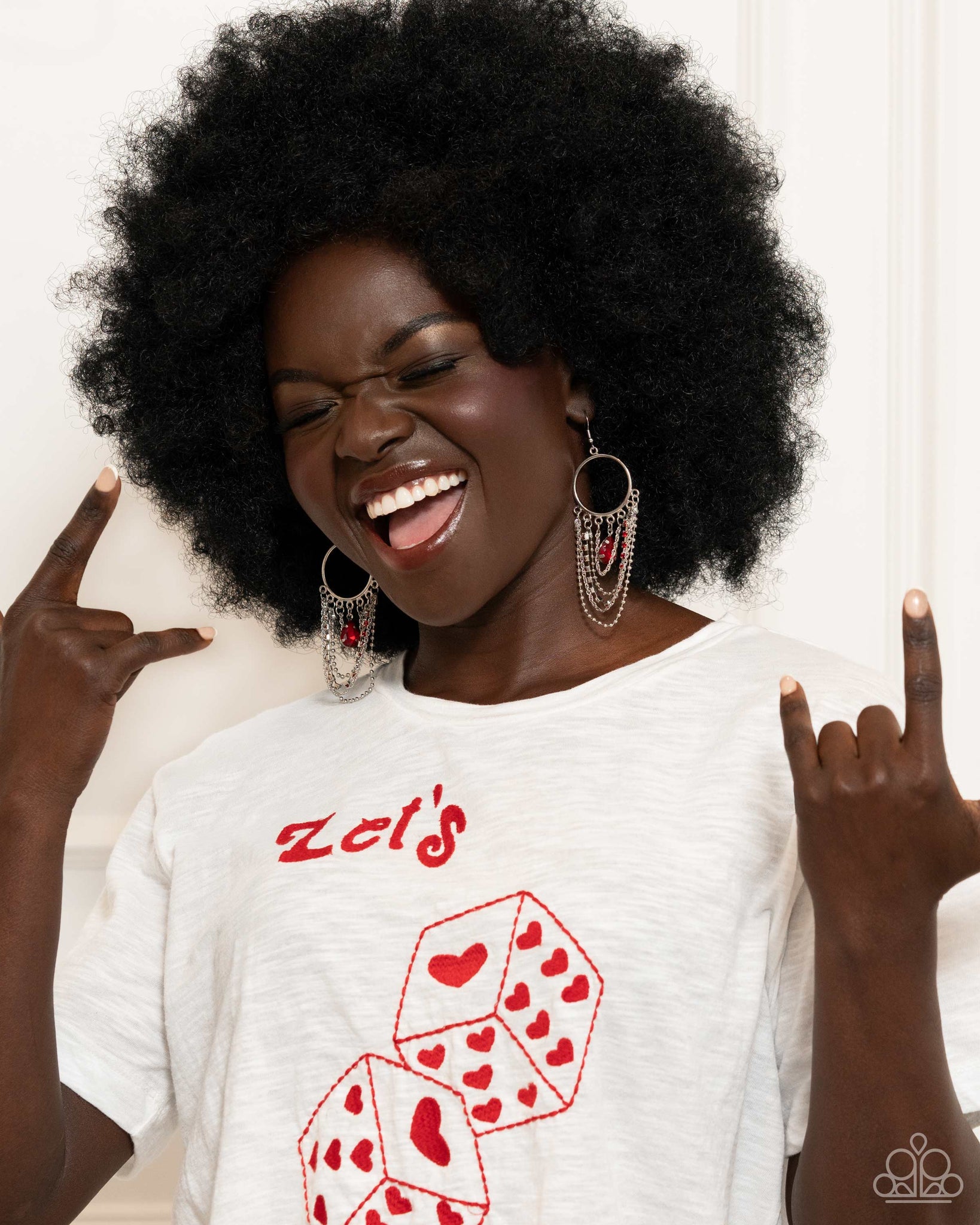 Mismatched silver chains, red rhinestones in square silver fittings, and a red faceted teardrop swing from the bottom of a shimmery silver hoop for an edgy look. Earring attaches to a standard fishhook fitting.