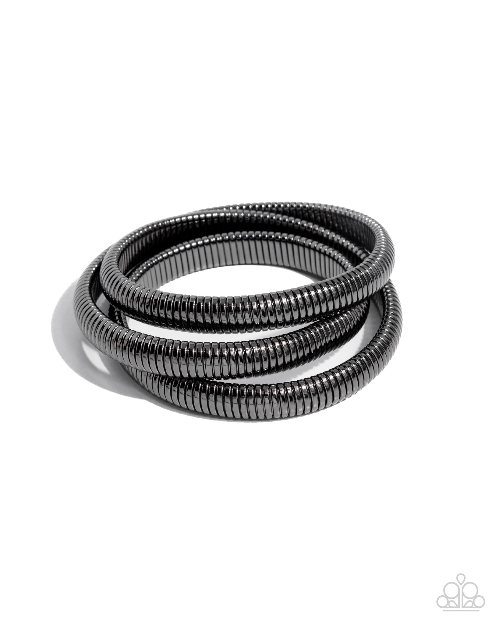 A bold gunmetal abstract chain resembling coils is threaded along a coiled wire, creating an industrial infinity wrap-style bracelet around the wrist.