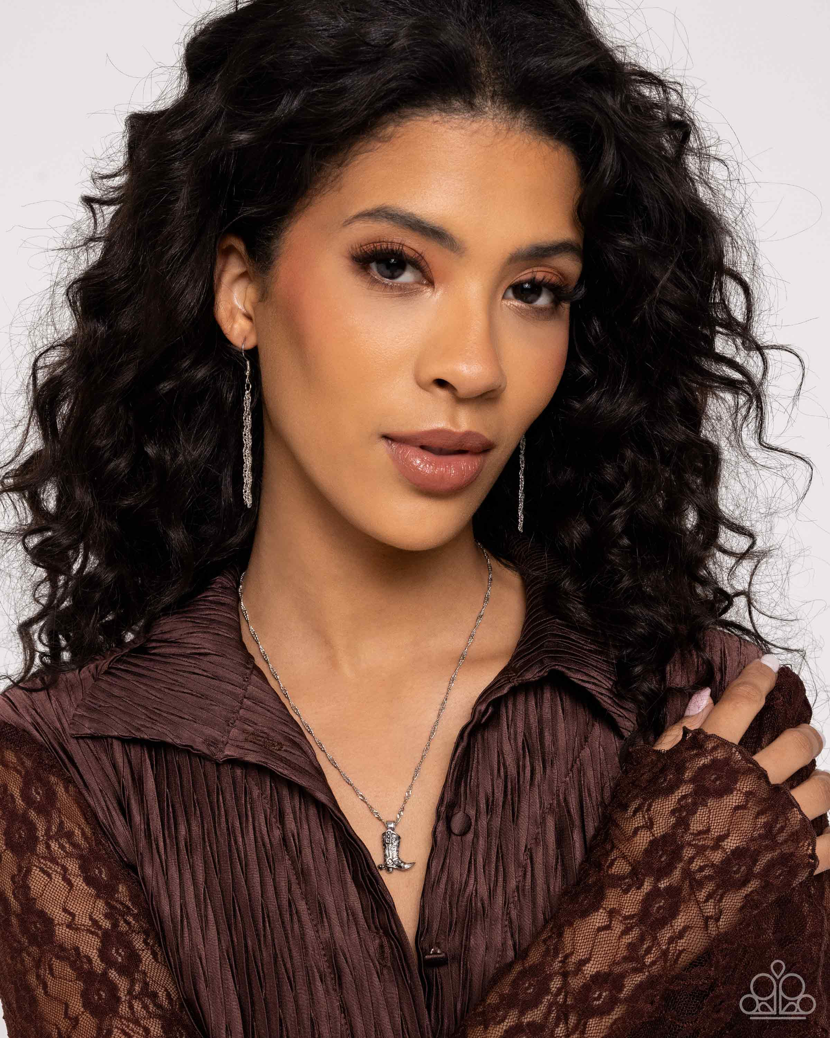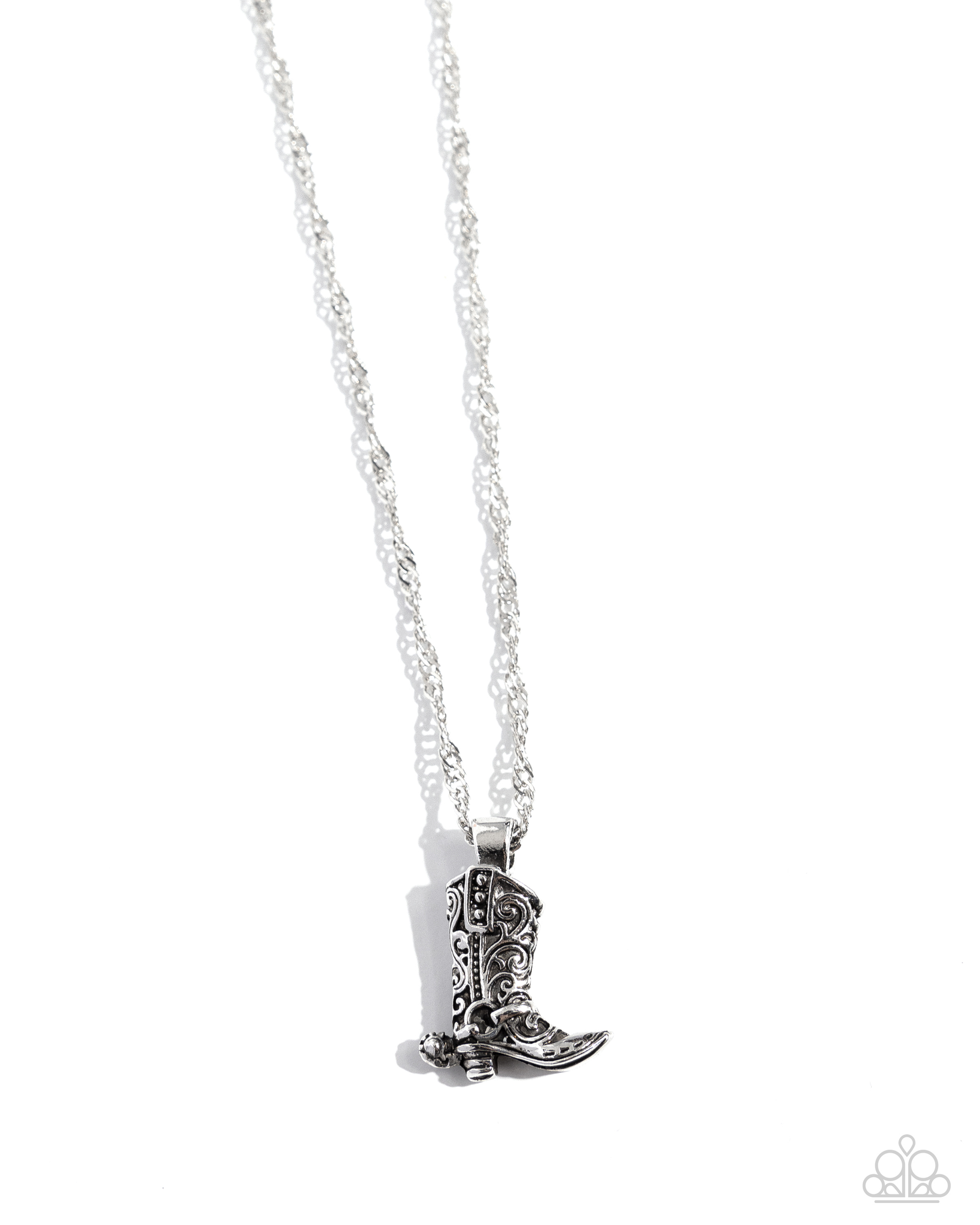 Gliding along a silver byzantine chain, a highly detailed silver cowboy boot, complete with a silver spur, dangles below the neckline for a cowboy-inspired centerpiece. Features an adjustable clasp closure.