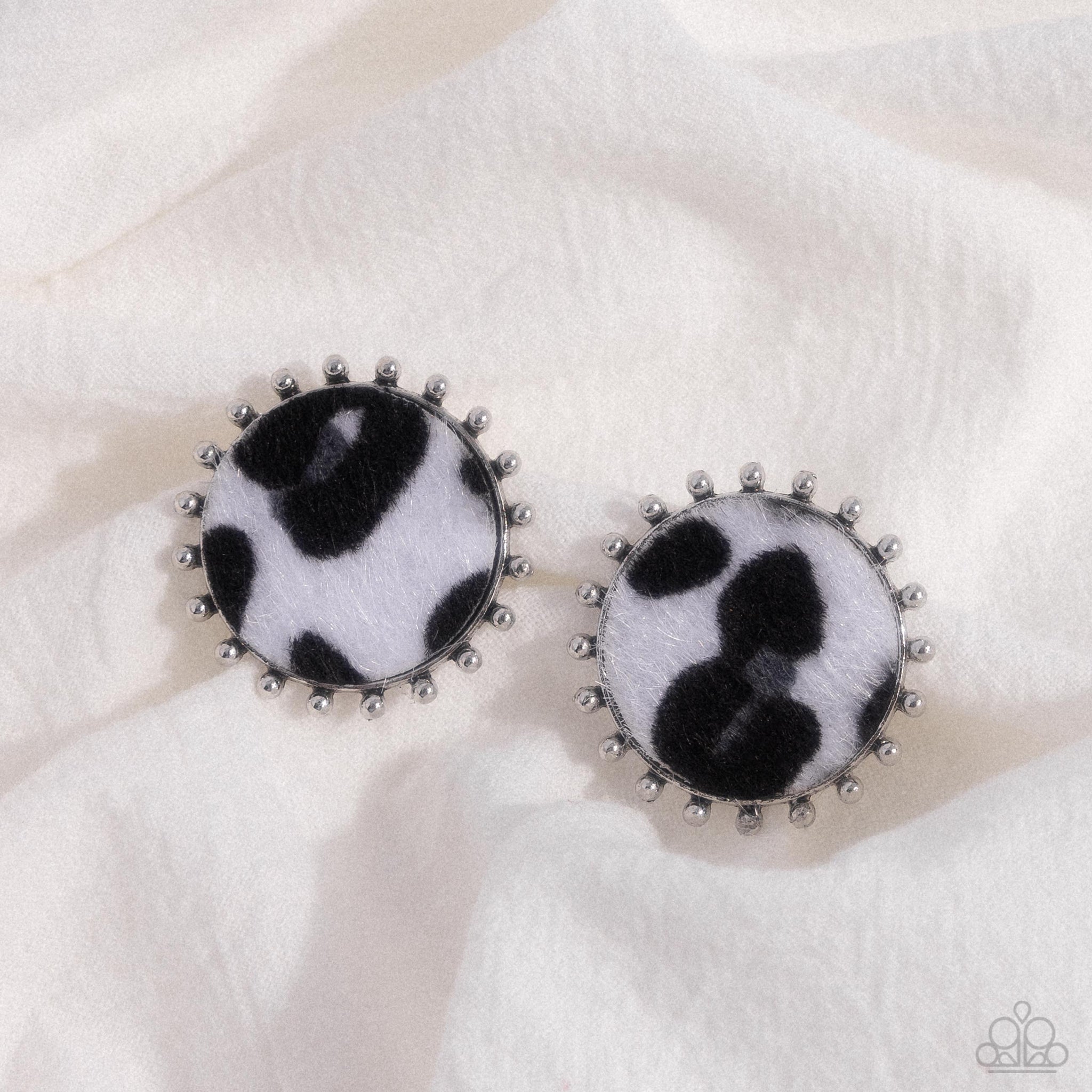 Featuring a silver-studded border, a black multicolored cow-printed material stands out atop the ear for a whimsically Western look. Earring attaches to a standard post fitting.