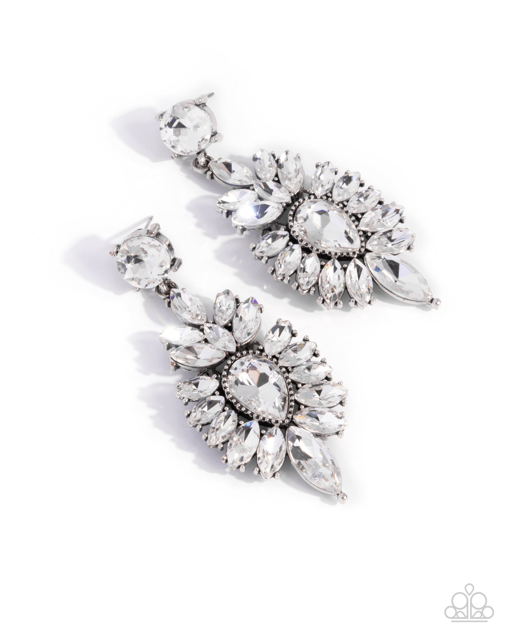 Pressed in a silver-pronged fitting, a solitaire faceted white gem gives way to an opulent explosion of round, teardrop, and marquise-cut white gems that bloom and fan out around a white teardrop gem center. The glitz and glam of each gem slowly increases in dimension and drama as it grows closer to the lower center of the design, maximizing its sparkle for a memorable finish. Earring attaches to a standard post fitting.