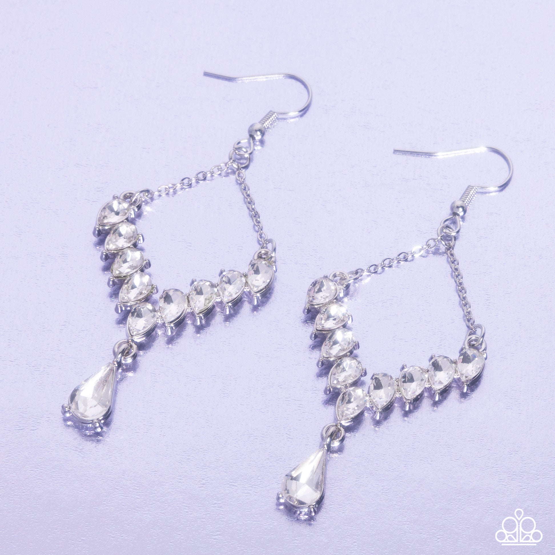 Suspended from dainty silver chains, a collection of upside-down white gem teardrops are pronged into a diamond-shaped frame below the ear, giving way to a solitaire teardrop white gem for a dramatic, dazzling fringe. Earring attaches to a standard fishhook fitting.