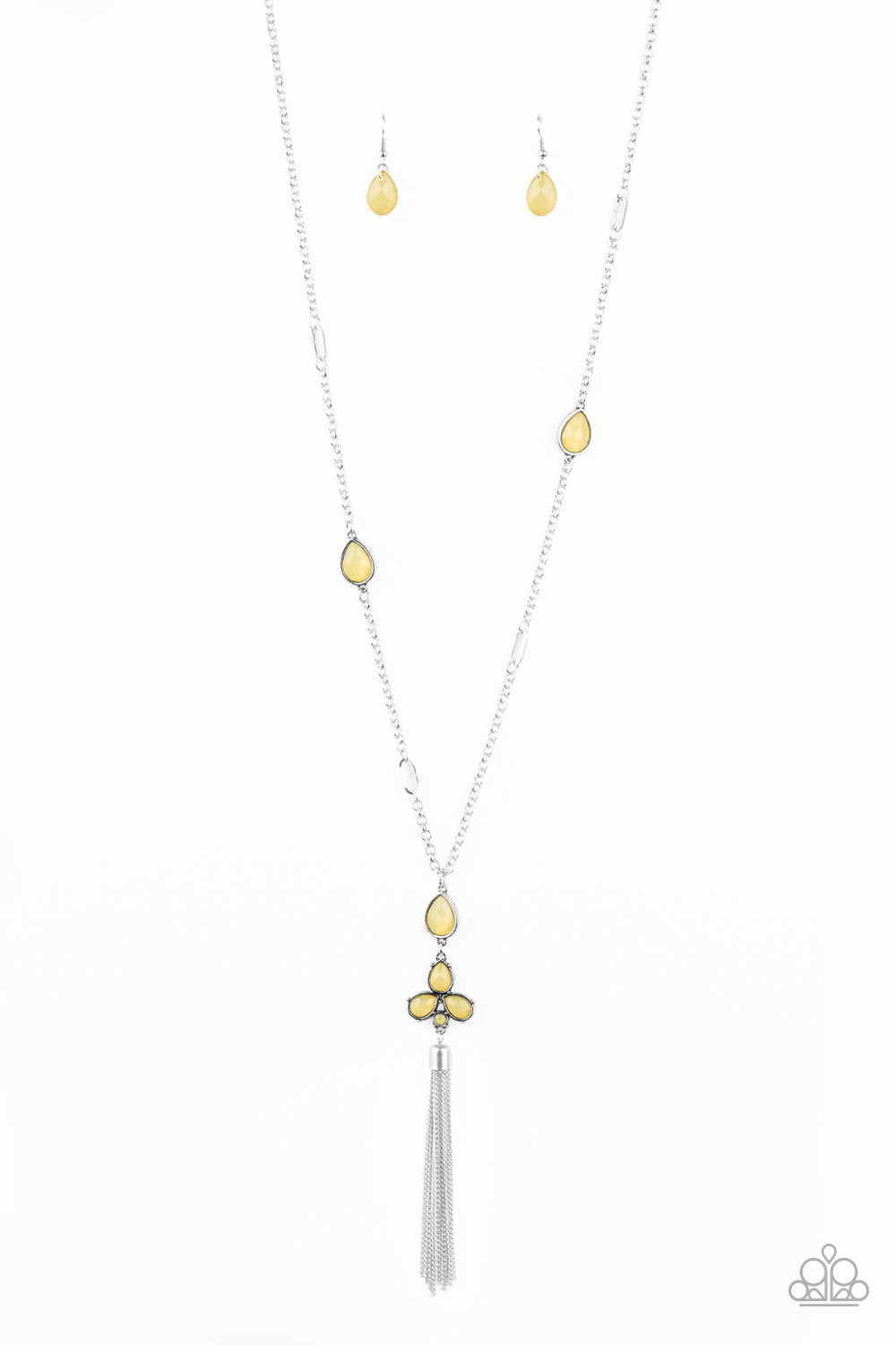 A cluster of dewy yellow teardrop beads coalesces at the bottom of a lengthened silver chain. Matching beads embedded in airy silver frames dot the chains that climb the chest, bringing an extra pop of color to the whimsical design. A glistening silver tassel cascades from the bottom of the colorful pendant, creating ethereal movement. Features an adjustable clasp closure.