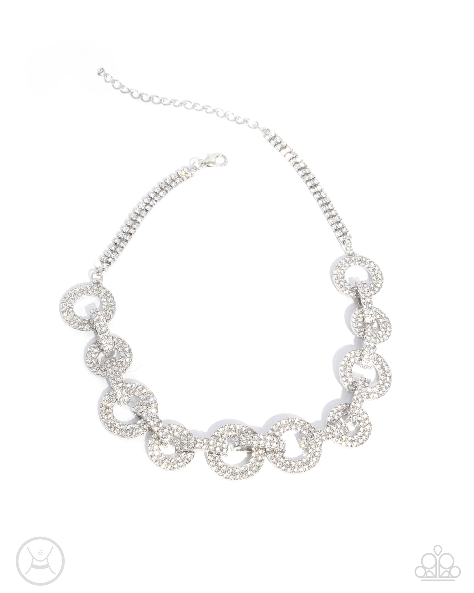 Interlocking silver circles encrusted with rows of glittering white rhinestones create a dazzling statement along the neckline. Duos of white rhinestones stream along either side of the design for added elegance. Features an adjustable clasp closure.