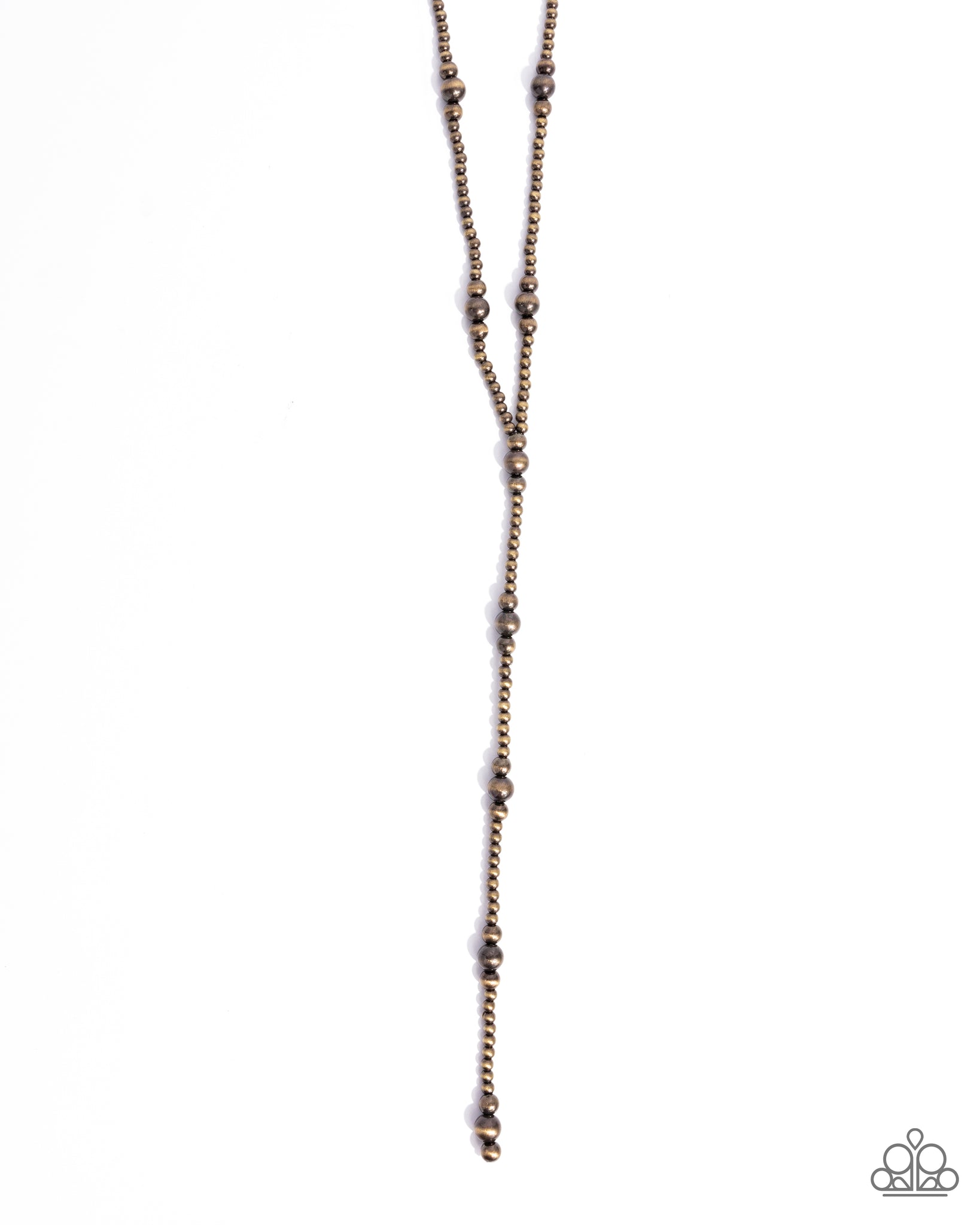 Infused along a y-shaped chain, a collection of dainty and larger brass beads gracefully drapes below the chest, creating a minimalist yet captivating look. Features an adjustable clasp closure.