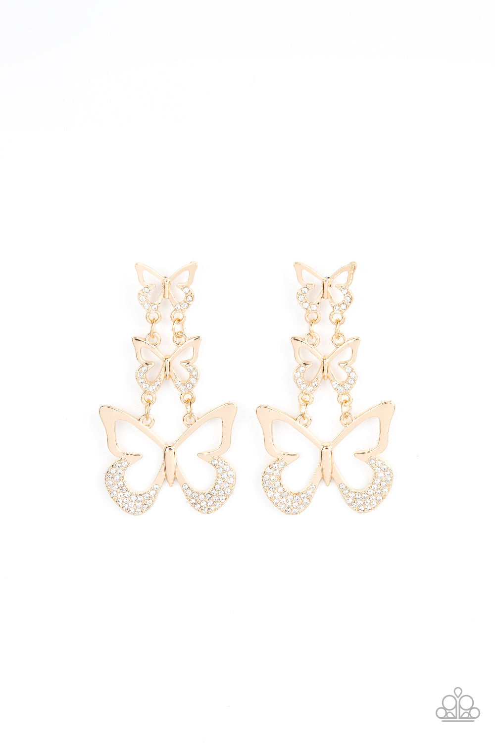 An airy trio of gold butterflies gradually increase in size as they link into a whimsical lure. The bottom of each butterfly has been dipped in white rhinestones, adding a glitzy finish to the fluttering centerpiece. Earring attaches to a standard post fitting.