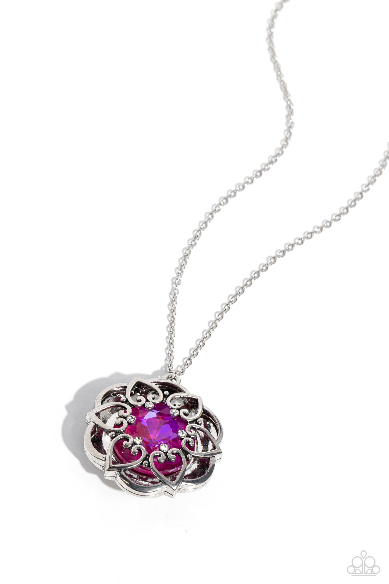 Pressed in the center of an oversized, thick silver floral frame, a pink UV gem glimmers from the chest. Intricate silver hearts, sprinkled with dainty white rhinestones, encircles the inner circle of the floral frame to create ornate, 3D petals. The whimsical pendant swings from the bottom of a lengthened, dainty silver chain for a seasonal look. Features an adjustable clasp closure.