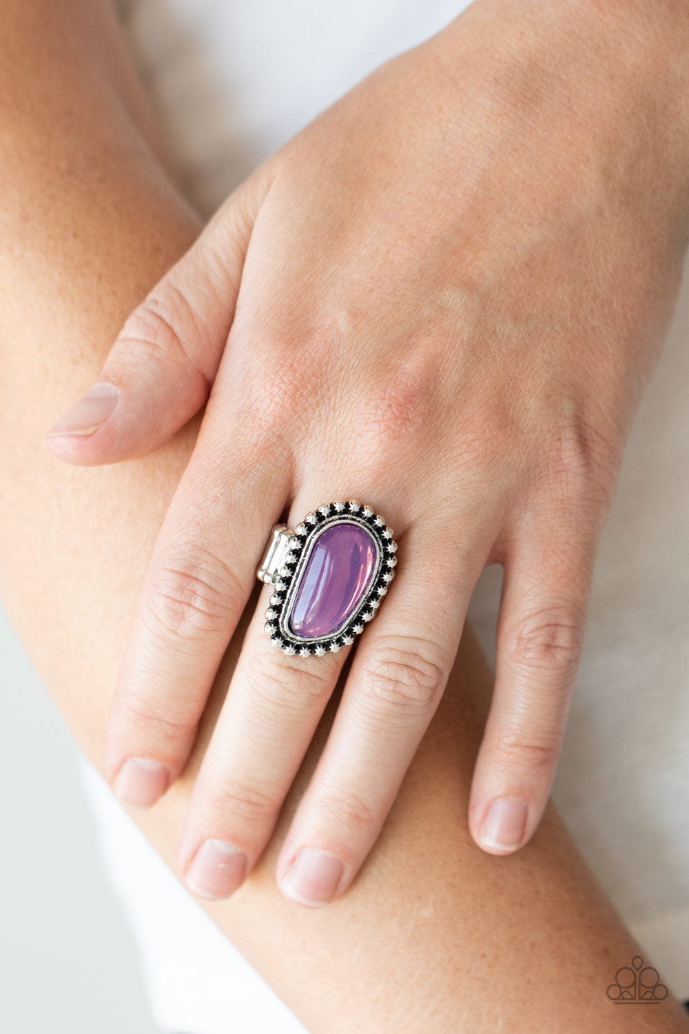 An asymmetrical opalescent purple stone is pressed into the center of a studded silver frame, creating an ethereal centerpiece atop the finger. Features a stretchy band for a flexible fit.