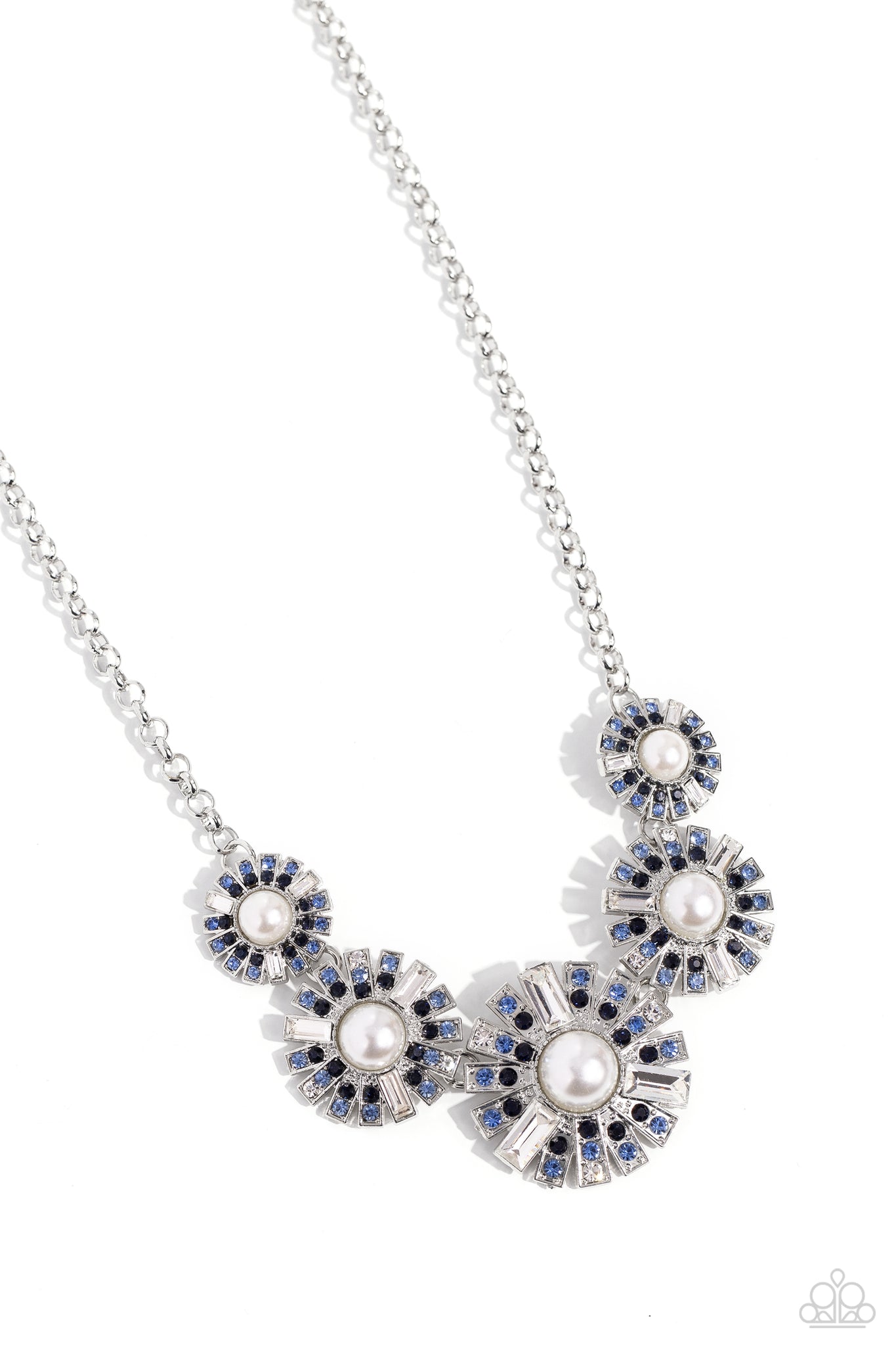 Sleek metal bars flare out from a mesmerizing pearl center, creating a blue and white stacked rhinestone-encrusted fringe of fanning frames. A trio of emerald-cut white gem bars are sprinkled across each dazzling display for a sassy finish. Features an adjustable clasp closure.