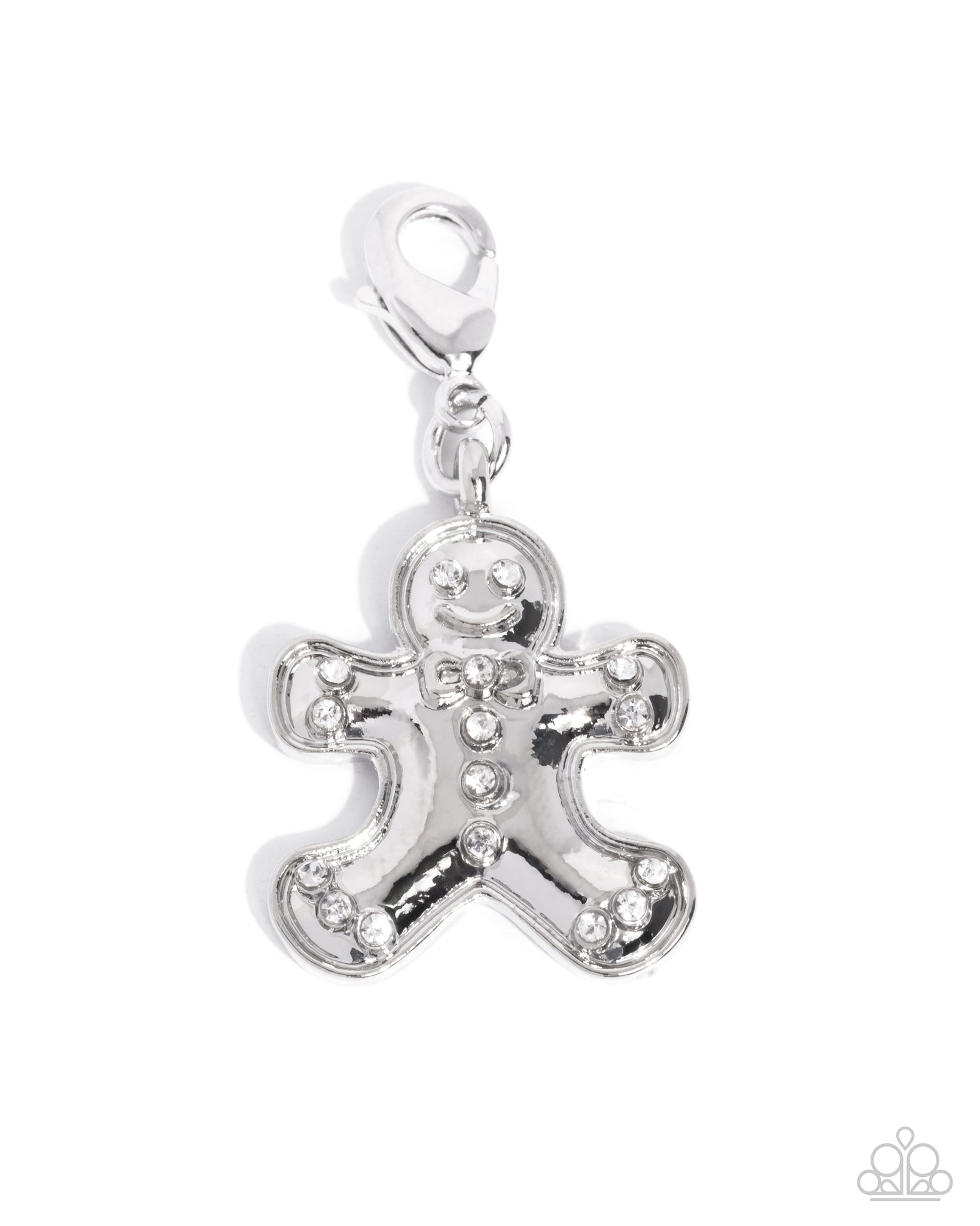Featuring a high-sheen Rhodium dip, a white rhinestone-detailed silver gingerbread man reflects light in every direction. Features a clasp closure. Can be attached to a variety of chains for a Christmas-inspired design. Charm measures approximately 3/4" in length.