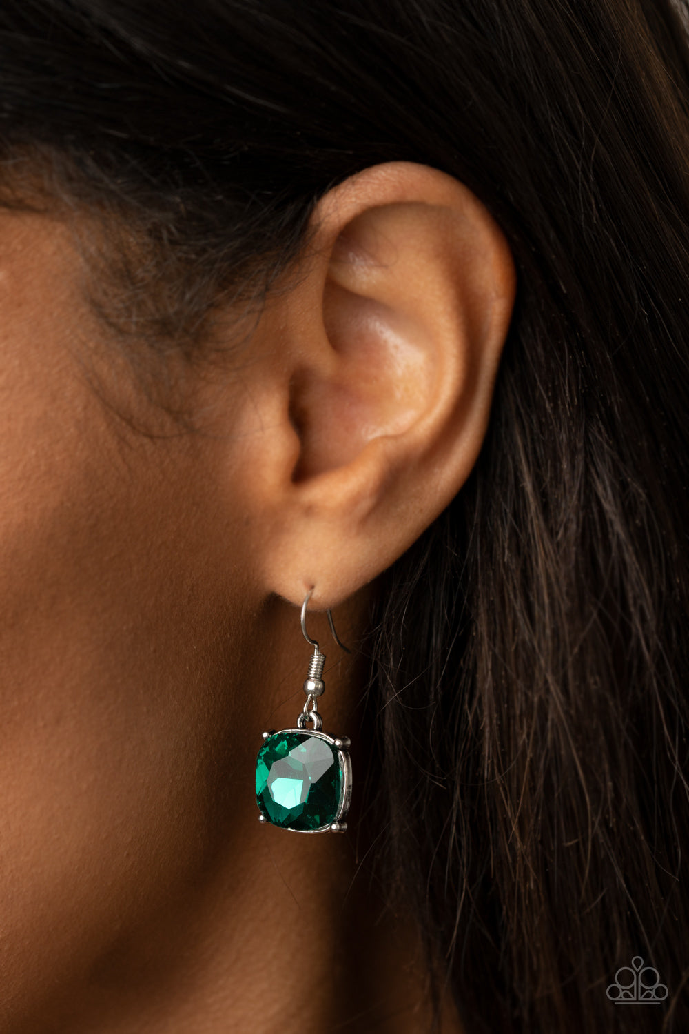 Nestled inside studded silver fittings, a trio of glittery green gems gives way to a shimmery silver chain tassel, creating a refined pendant. Features an adjustable clasp closure.
