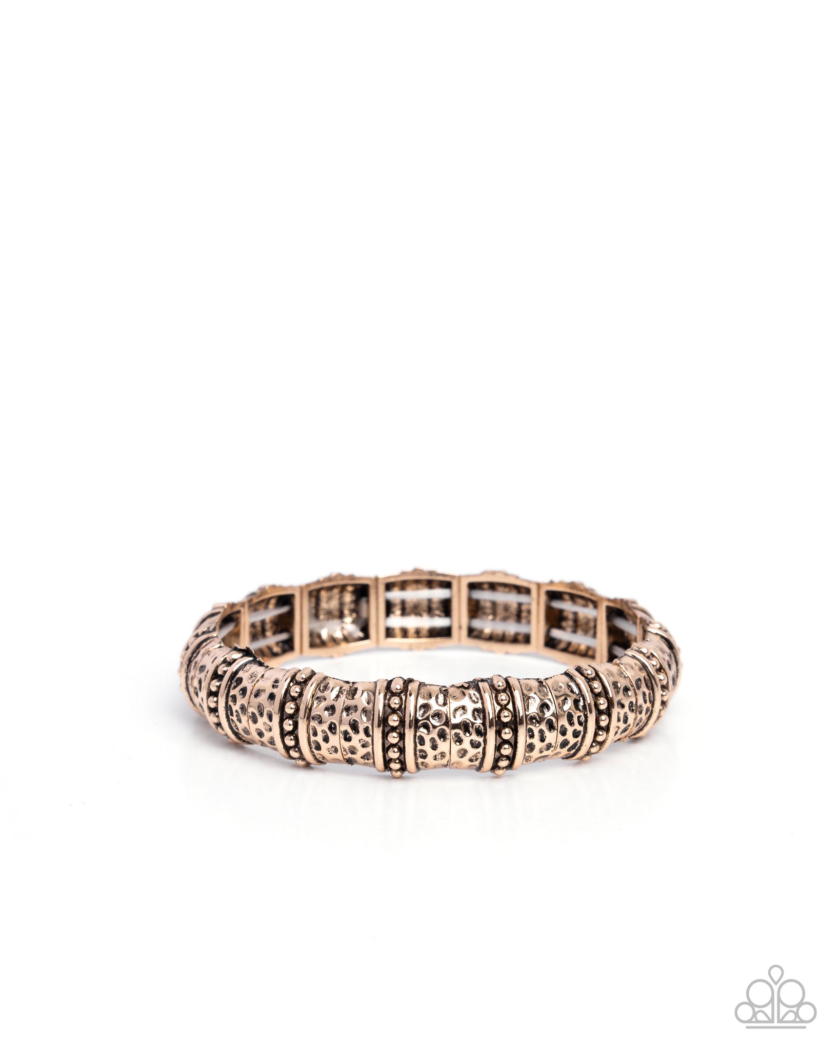 Threaded along invisible stretchy bands, intricately detailed gold segments, each adorned with dotted accents and antiqued grooves create a striking contrast. The alternating patterns of texture and design create a bold, structured look that radiates edgy sophistication.