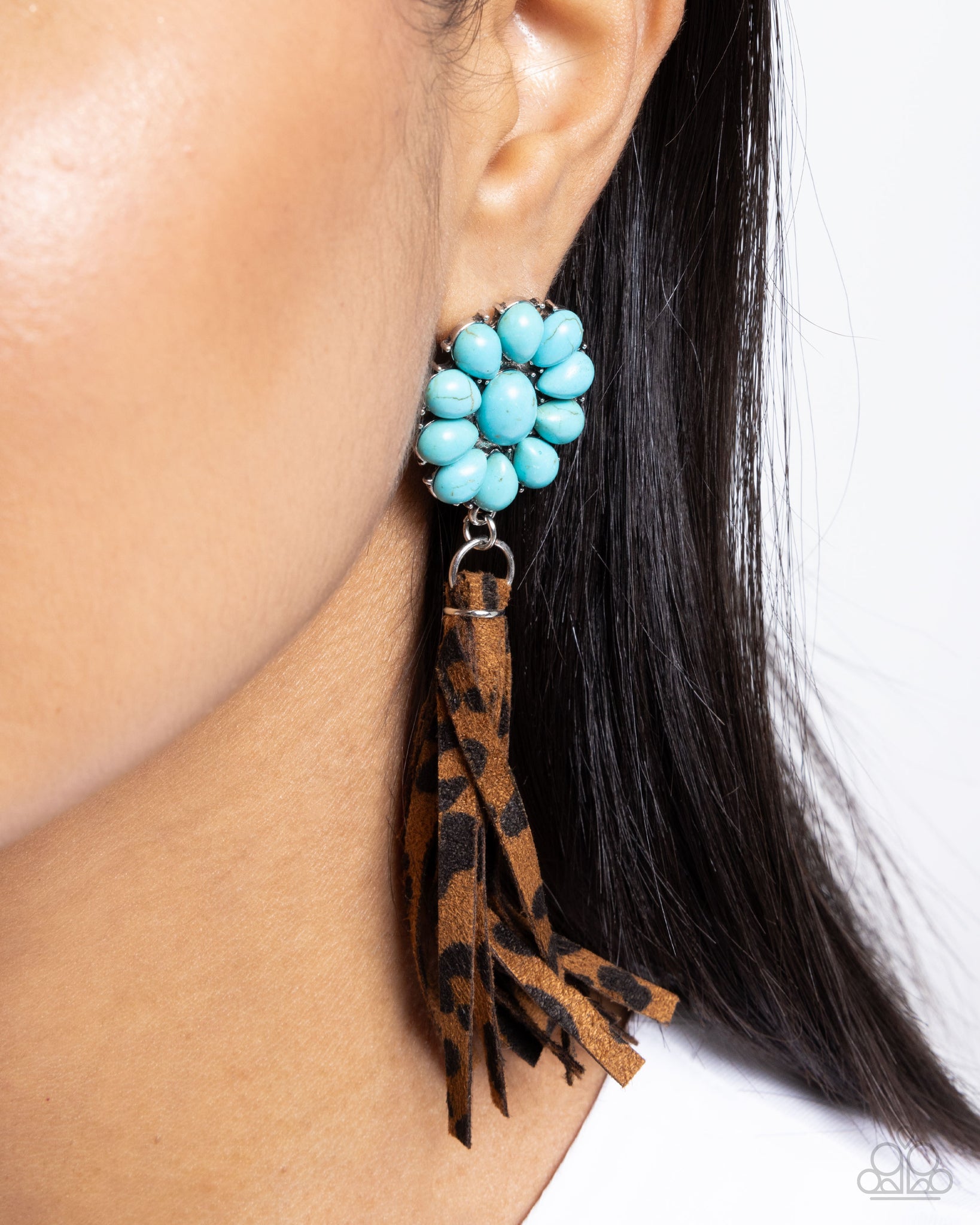 Featuring uniform teardrop cuts, turquoise stones are pressed into a daintily studded silver frame, encircling a turquoise oval stone, creating an earthy flower atop the ear. Strands of brown leopard-printed suede sway from the stony centerpiece for a touch of bold, eye-catching color. Earring attaches to a standard post fitting. As the stone elements in this piece are natural, some color variation is normal.