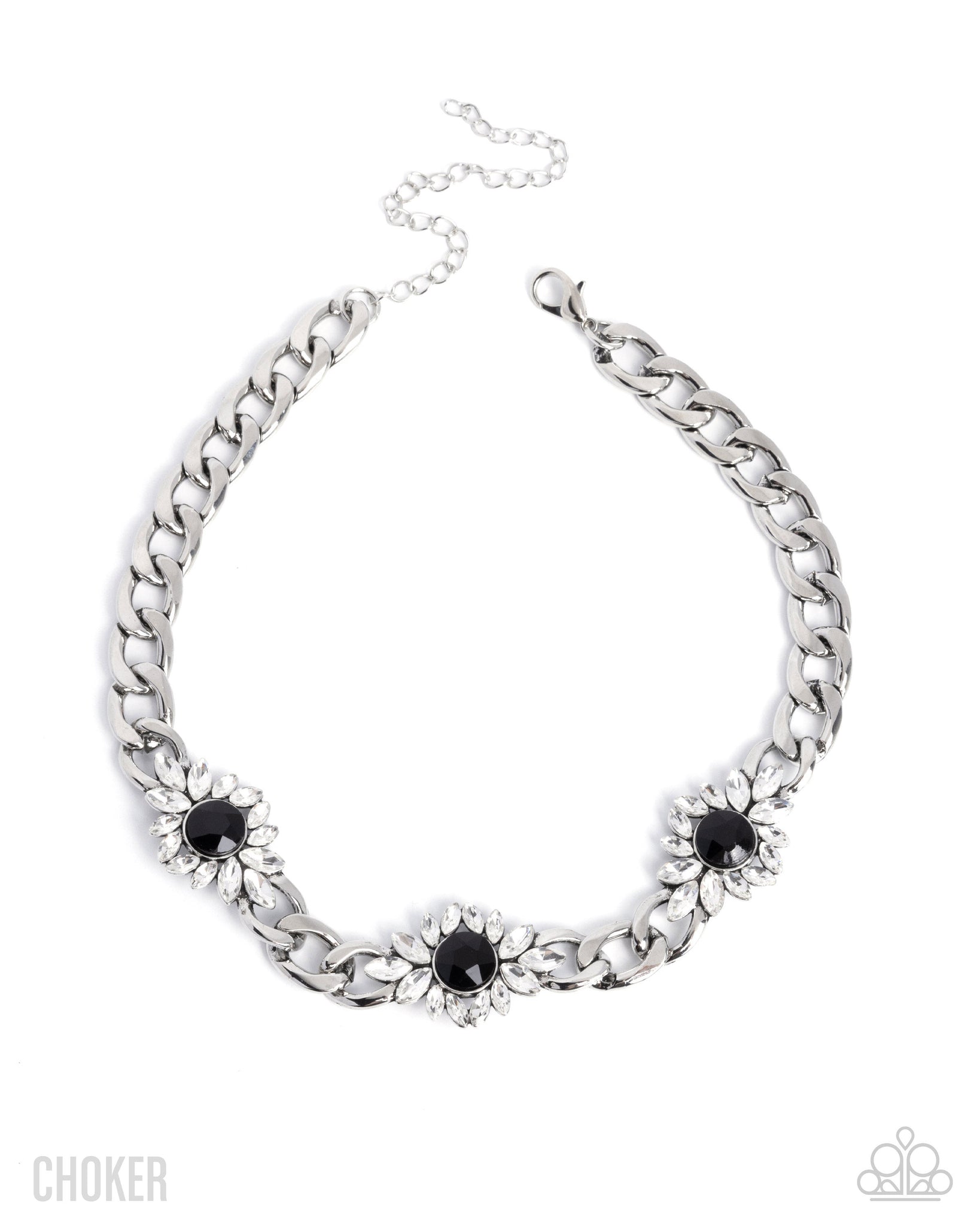 Framed by sunburst-like, white marquise-cut gems in silver fittings, a collection of round black gems is sporadically placed along a silver curb chain for a standout statement. Features an adjustable clasp closure.