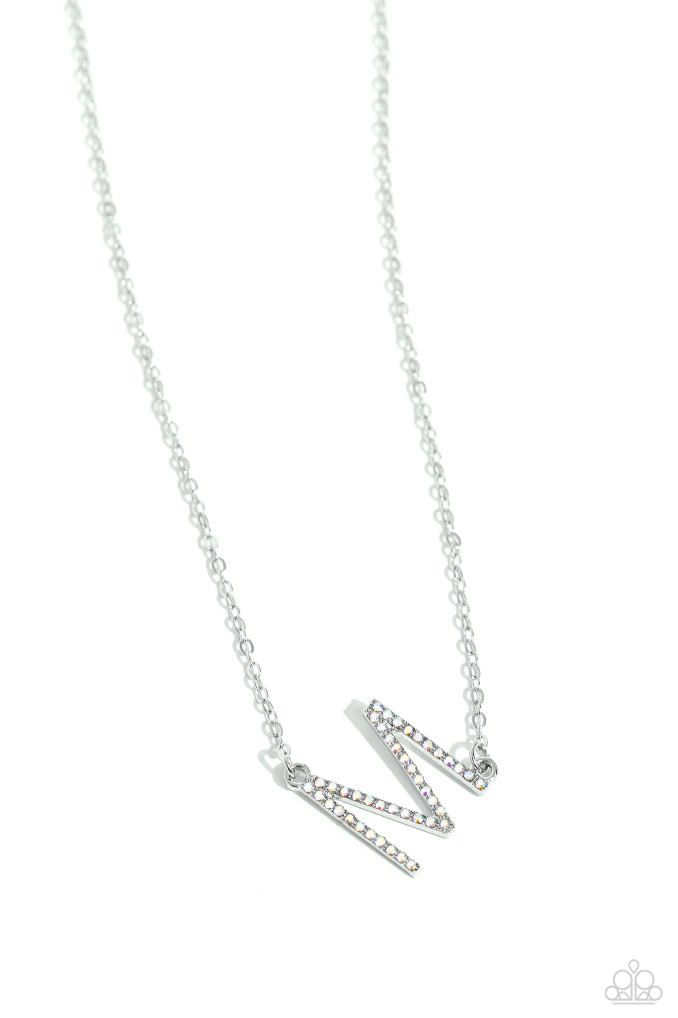Embossed with dainty iridescent rhinestones, a silver letter "M" hovers below the collar from a dainty silver chain, for a sentimentally simple design. Features an adjustable clasp closure. Due to its prismatic palette, color may vary.