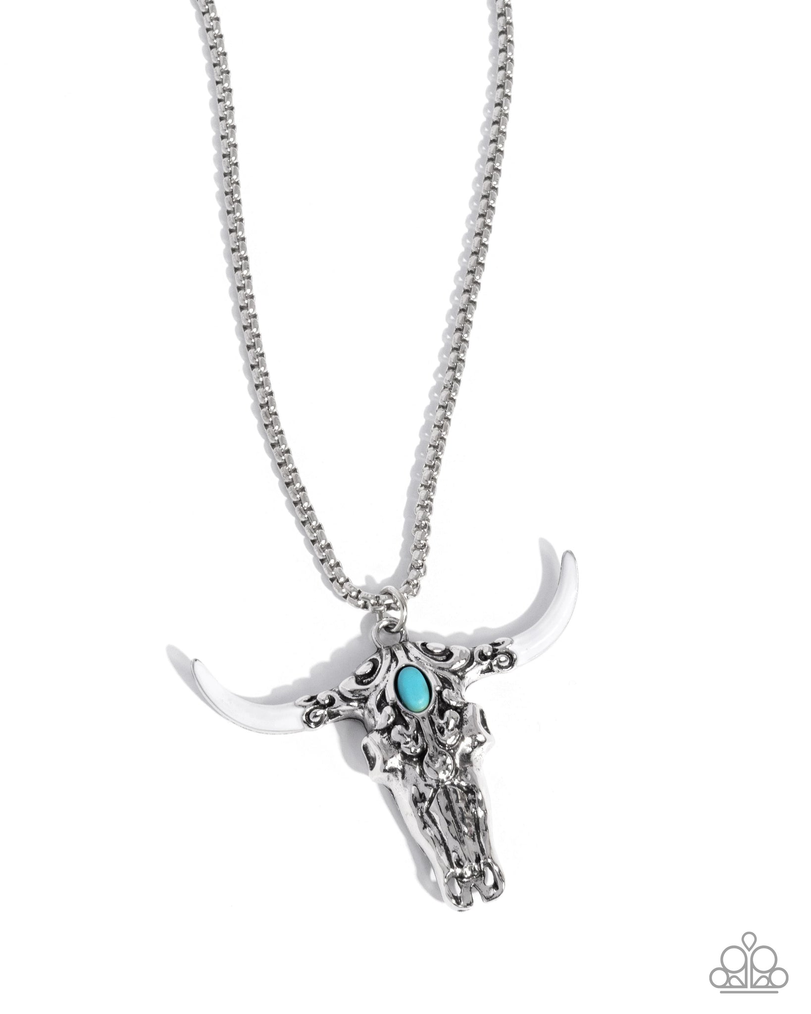 A silver rope chain features a bull skull pendant accented with white-painted horns and a turquoise stone centerpiece. The intricate details of the pendant bring a bold and rustic edge to the design. Features an adjustable clasp closure.
