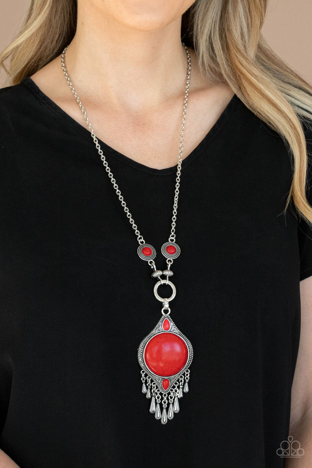 Dotted with ornate silver beads and red stone dotted silver frames, lengthened silver chains give way to a studded medallion-like frame. Dotted with an oversized red stone center, the decorative pendant gives way to a fringe of teardrop silver beads for an authentic southwestern finish. Features an adjustable clasp closure.