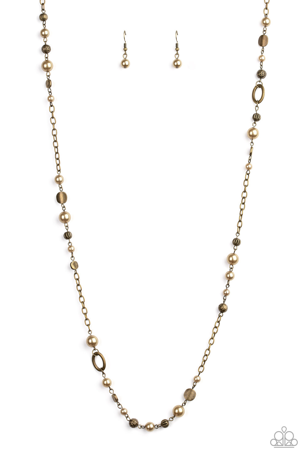 A collection of mismatched brass accents and pearly brass beads trickle along a shimmery brass chain for a sophisticated look. Features an adjustable clasp closure.