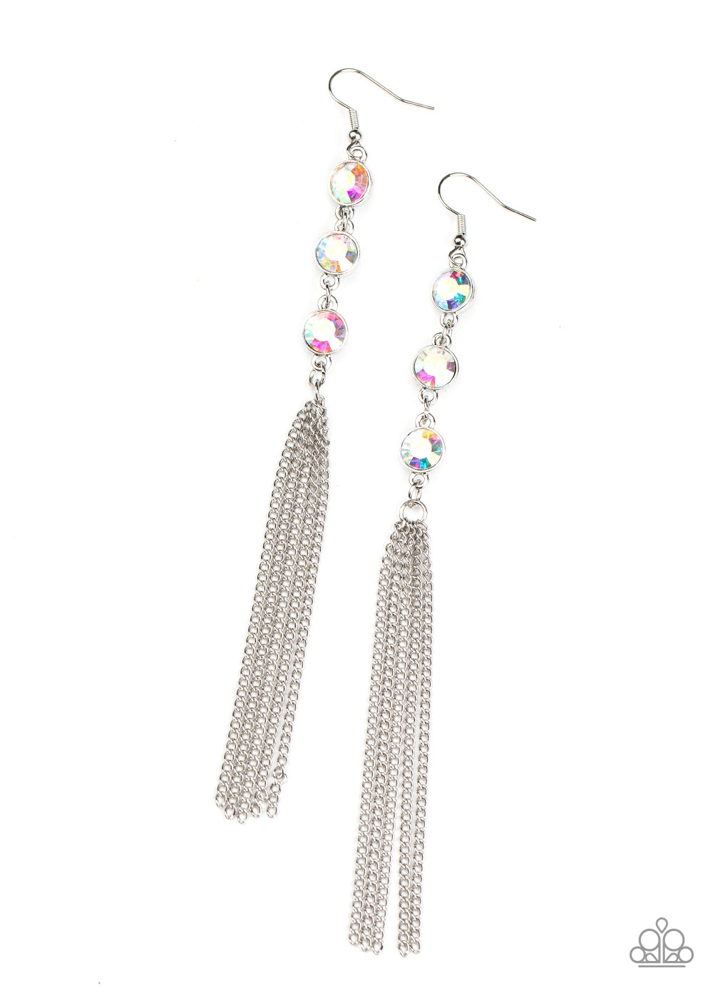 A shimmery silver chain tassel swings from the bottom of a stack of three iridescent rhinestones, creating a fabulously tiered look. Earring attaches to a standard fishhook fitting.