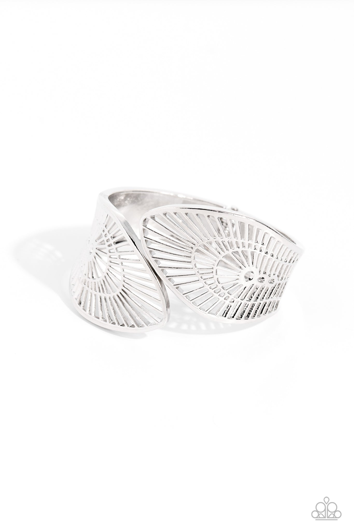 Glistening silver bars coalesce into an airy stenciled palm leaf-like bracelet around the wrist for a whimsically metallic look. Features a hinged closure.