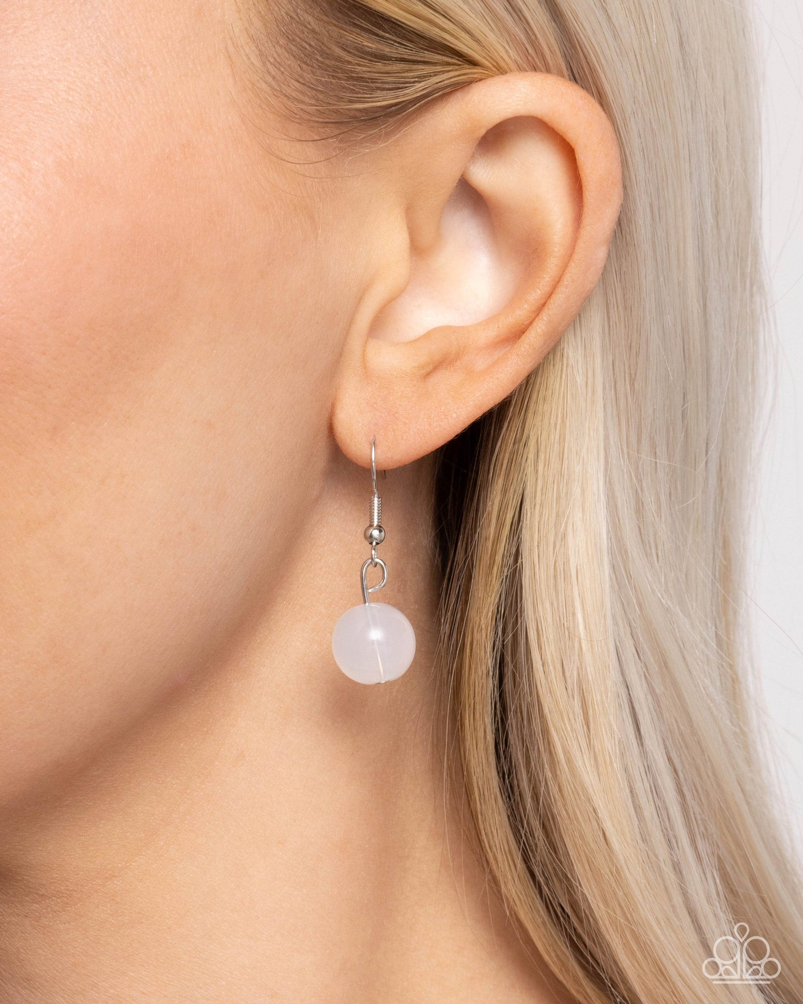 Connecting to an elongated silver chain, a collection of Parisian-inspired charms including a white bead, a white rosette set in the center of a textured silver flower, a white rhinestone-embellished textured silver Eiffel tower, a white rhinestone-embellished silver ornament, a silver-studded key, an airy silver studded bow, and an oversized silver filigree-embellished heart cascades from a silver hoop for a refined display. Features an adjustable clasp closure.