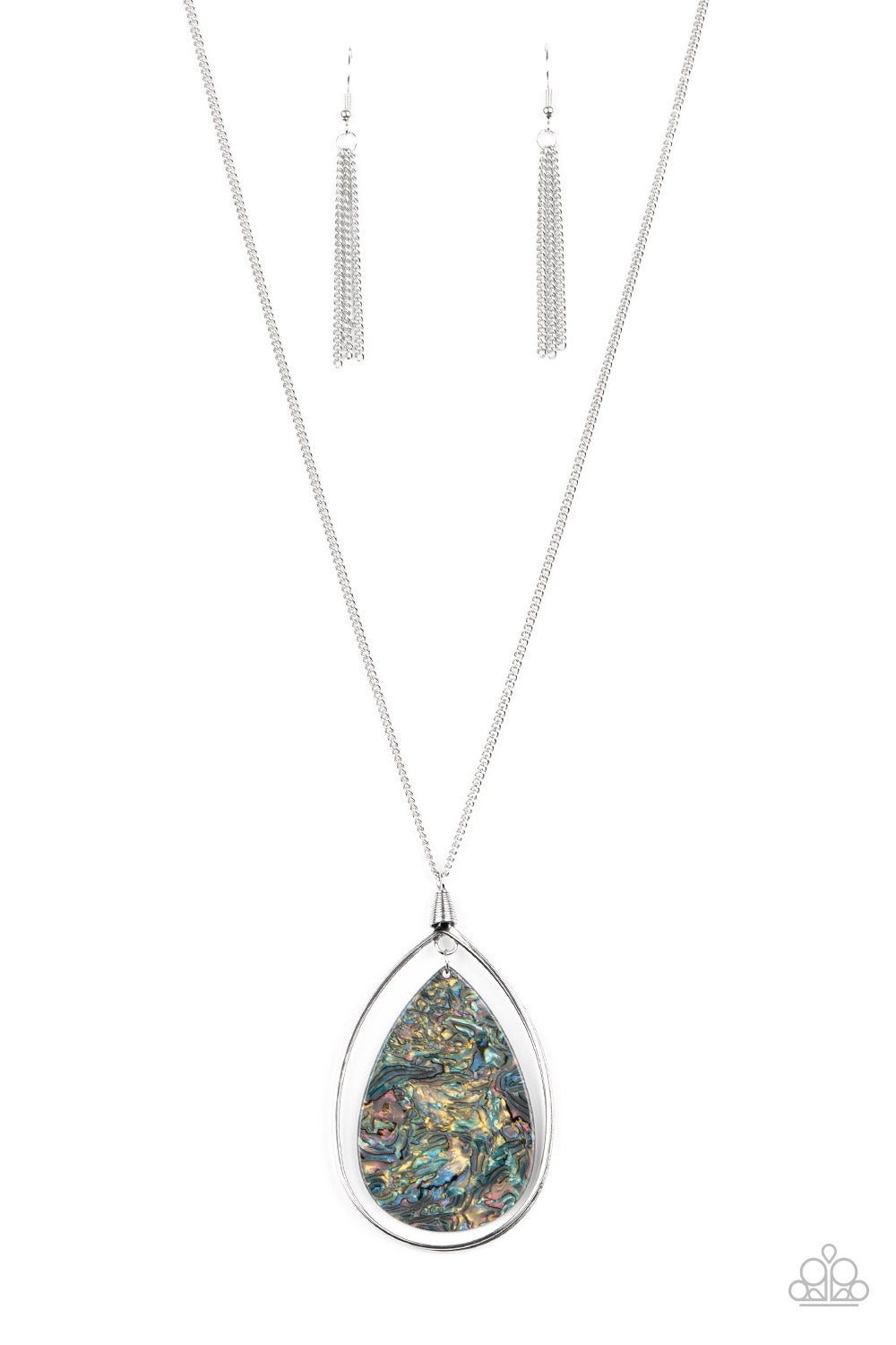 Swirling with an iridescent watercolor background, an acrylic teardrop swings from the bottom of a silver teardrop frame, creating a dreamy pendant at the bottom of a lengthened silver chain. Features an adjustable clasp closure.