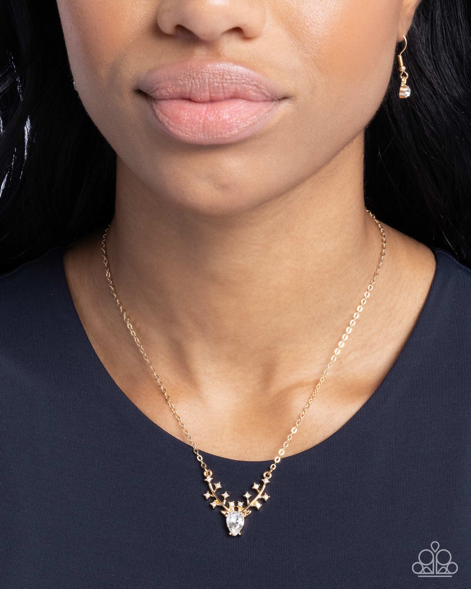 Inspired by a stag, a pair of gold antlers, dotted with glistening white rhinestones, flair out from a white upside-down teardrop gem and a pair of sleek gold ears, connecting to a dainty gold cable chain for a festive flashy display below the neckline. Features an adjustable clasp closure.