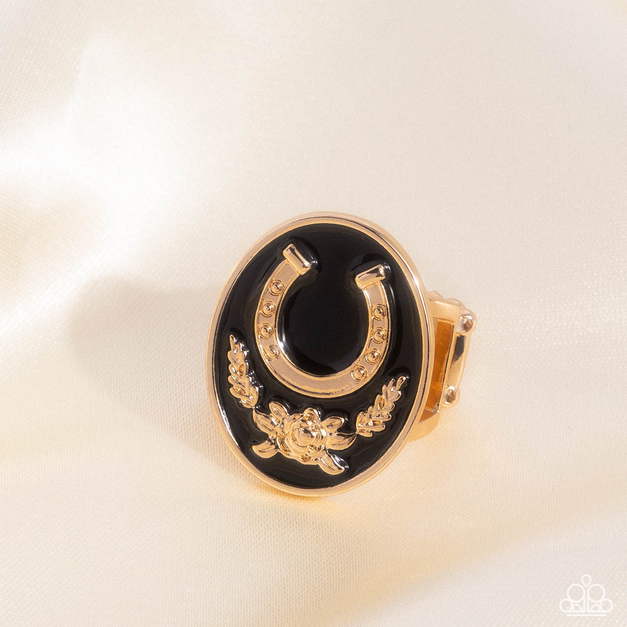 Embellished atop a black-painted gold oval frame, a gold textured horseshoe rests above a bouquet of gold flowers for an elegantly equestrian look. Features a stretchy band for a flexible fit.