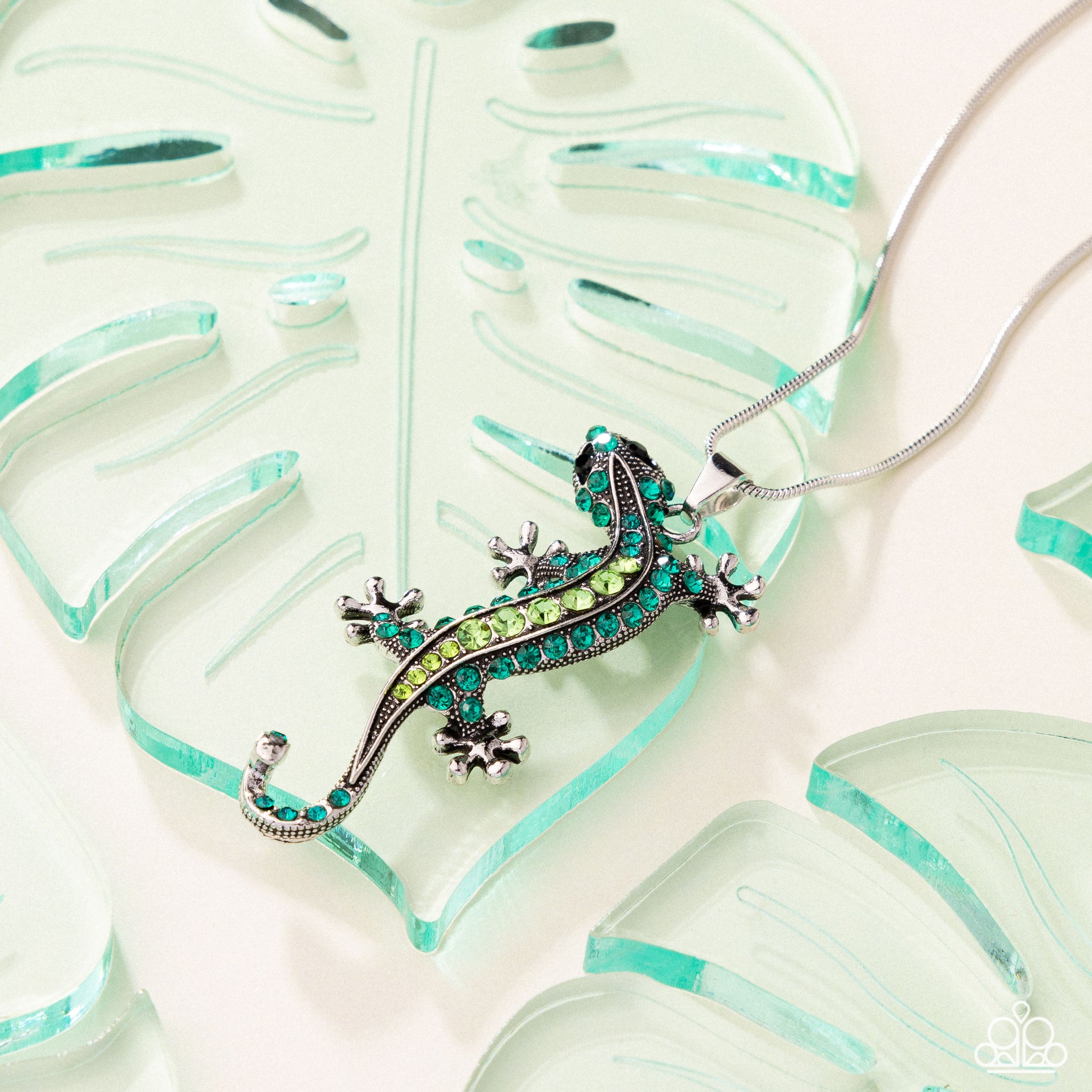 A sleek silver chain displays a salamander-shaped pendant encrusted with sparkling green rhinestones, creating a vibrant and whimsical design. Features an adjustable clasp closure.
