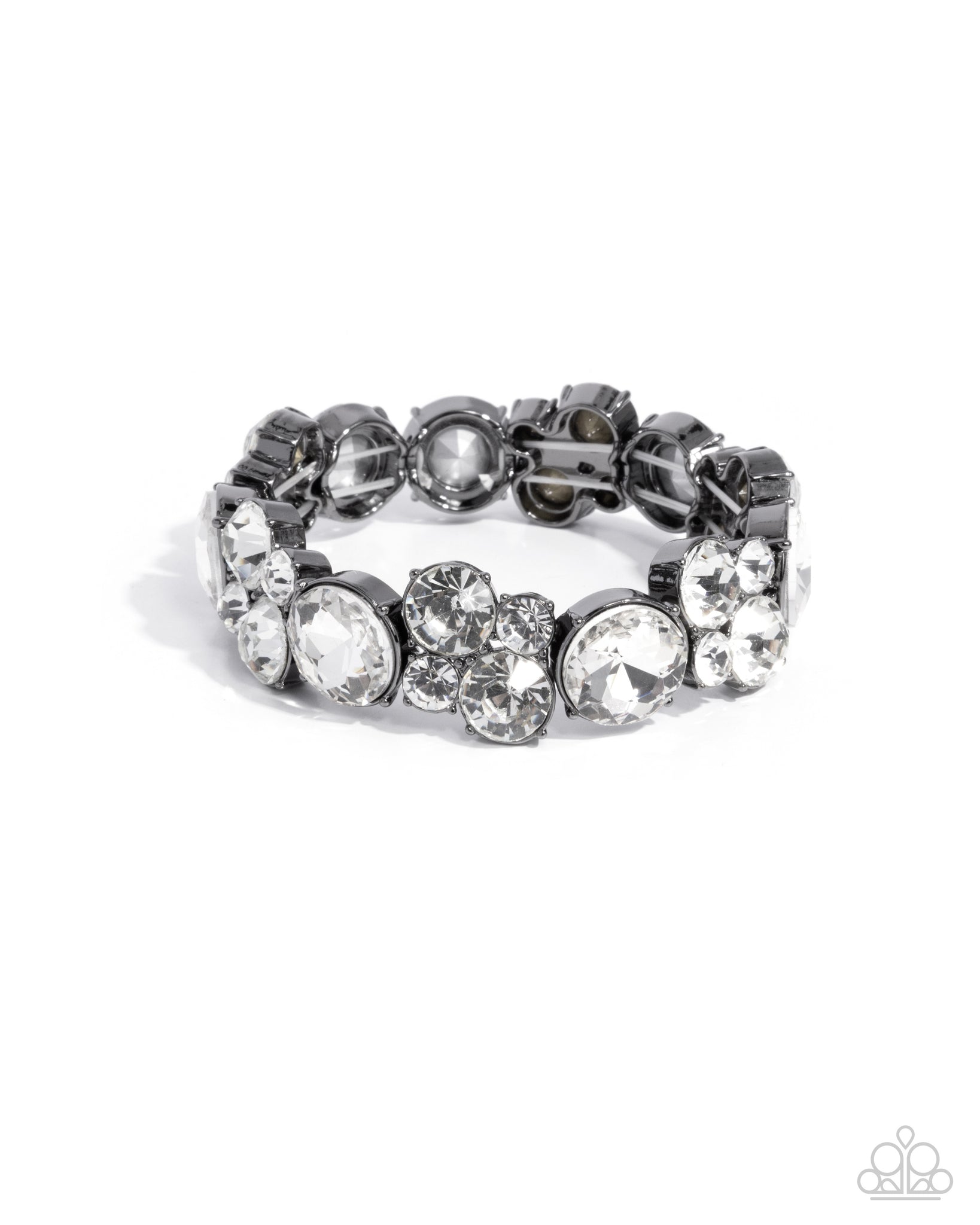 Infused along elastic stretchy bands, highly faceted white gems pressed in pronged gunmetal fittings alternate with a quartet of white gems also pressed in a cluster of gunmetal-pronged fittings for a mismatched, momentous amount of shimmer.