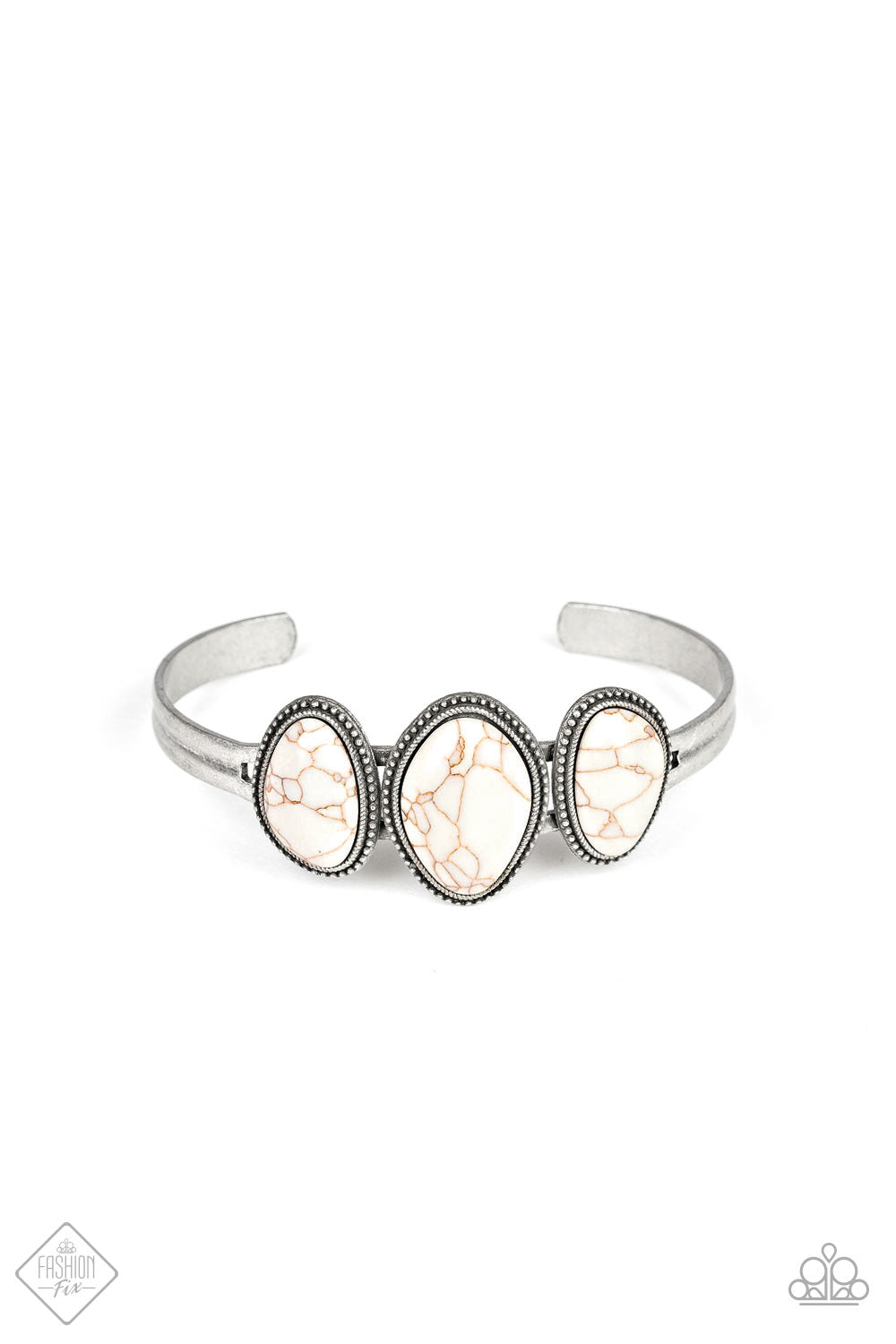 Featuring asymmetrical shapes, a trio of refreshing white stones are pressed into studded tin finished frames atop a dainty cuff in the same rustic finish.