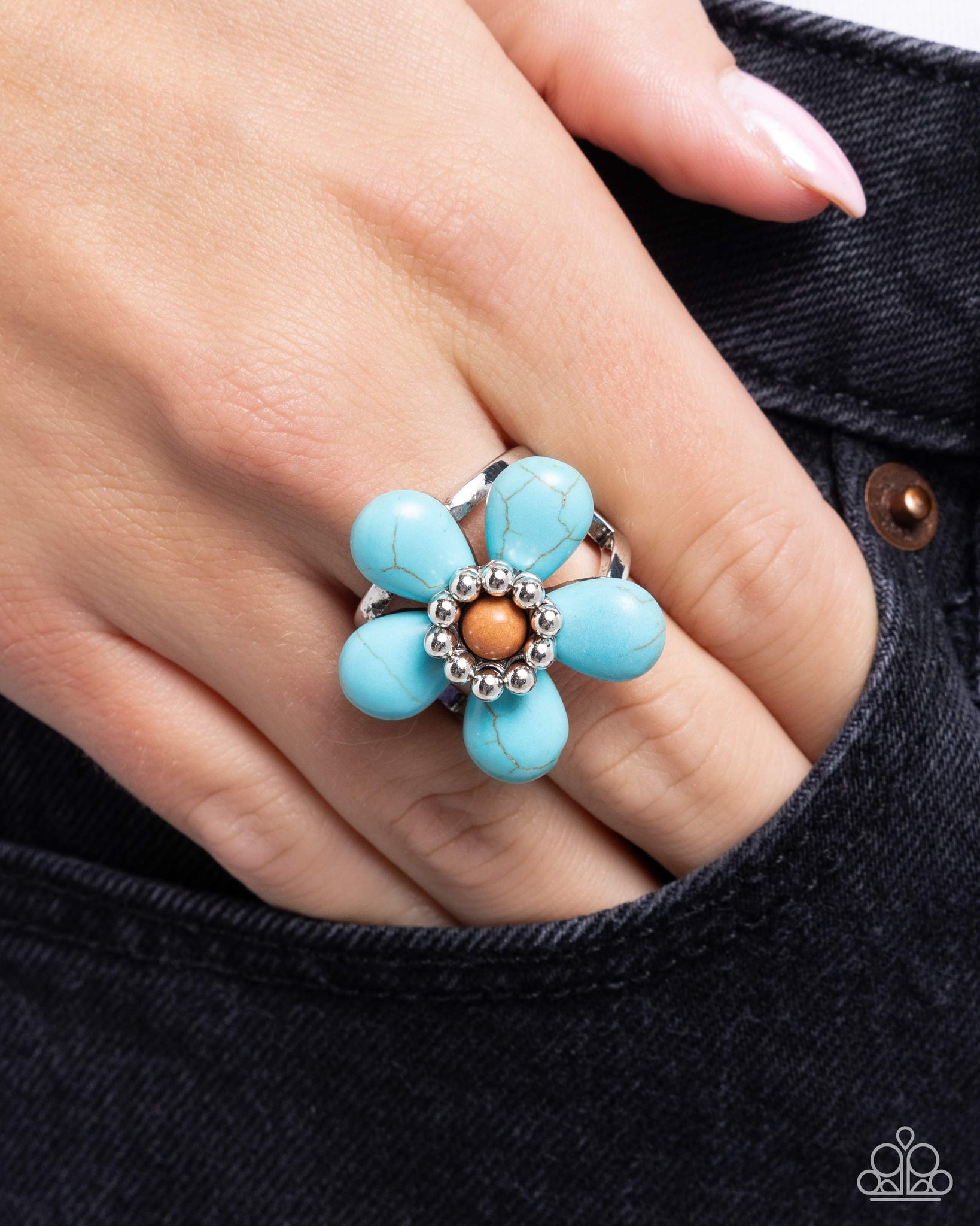 Dainty turquoise stones make up the petals of a floral frame, radiating from a Buckthorn Brown center bead bordered by silver studs. Features a stretchy band for a flexible fit. As the stone elements in this piece are natural, some color variation is normal.