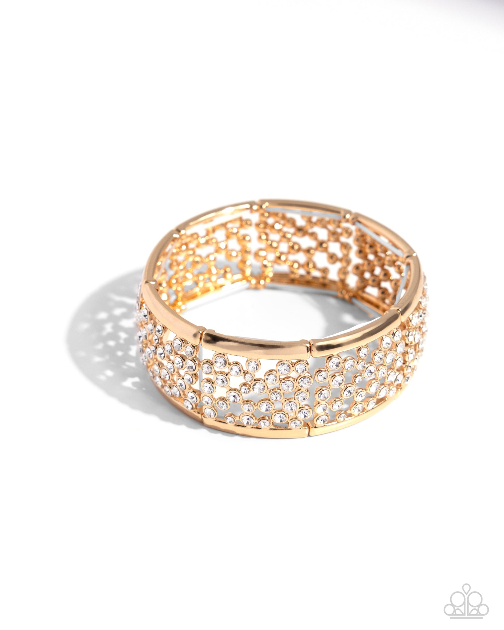 Scattered between two curved gold bars, a collection of white rhinestones in circular fittings curve up the wrist along elastic stretchy bands for a framed, shimmery showcase.
