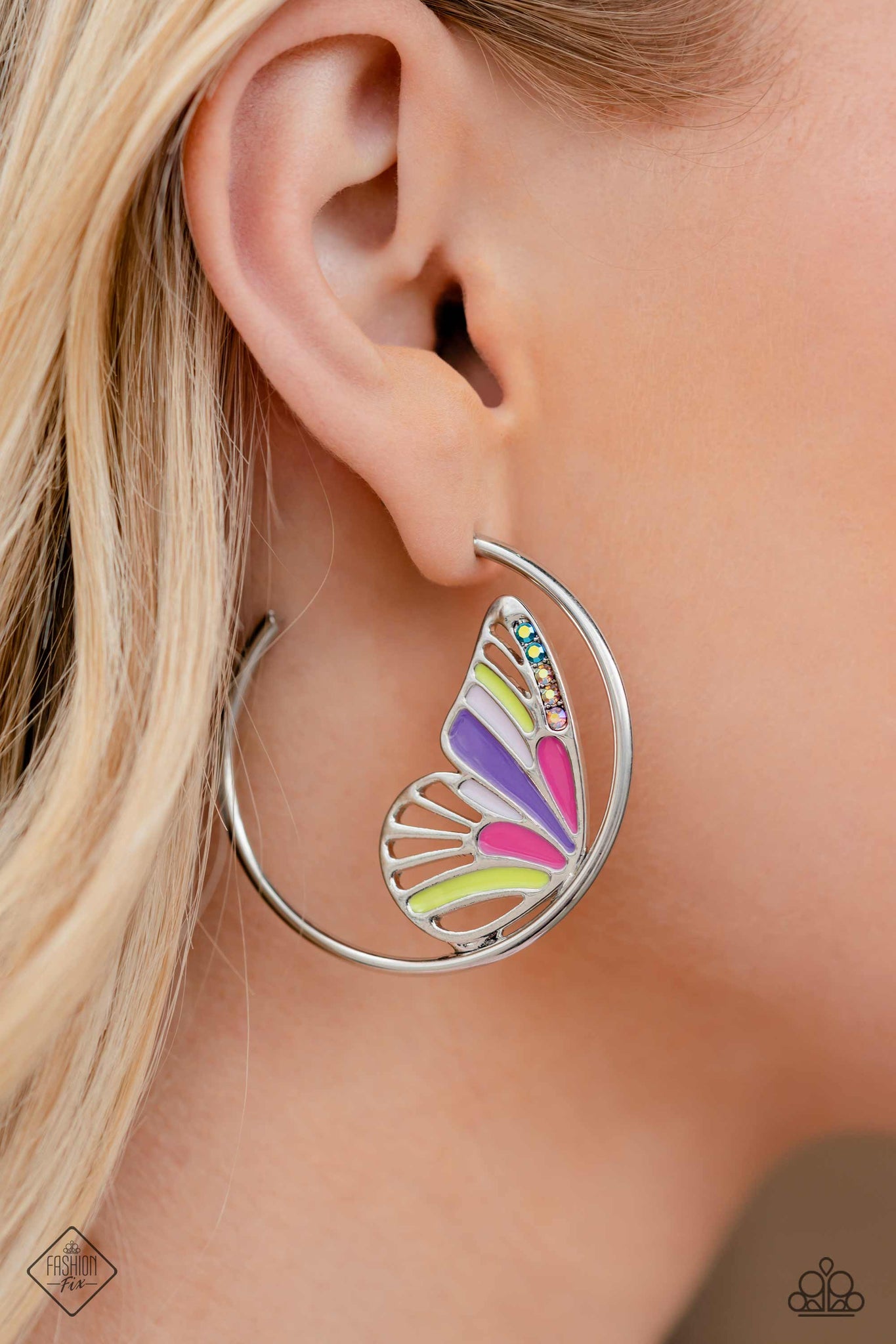 An oversized silver butterfly wing, splashed with baby pink, Fuchsia Fedora, Love Bird, and multicolored iridescent rhinestones, nestles along the inner curve of a glistening silver hoop, creating a whimsically colorful sight. Earring attaches to a standard post fitting. Hoop measures approximately 1 3/4" in diameter. Due to its prismatic palette, color may vary.