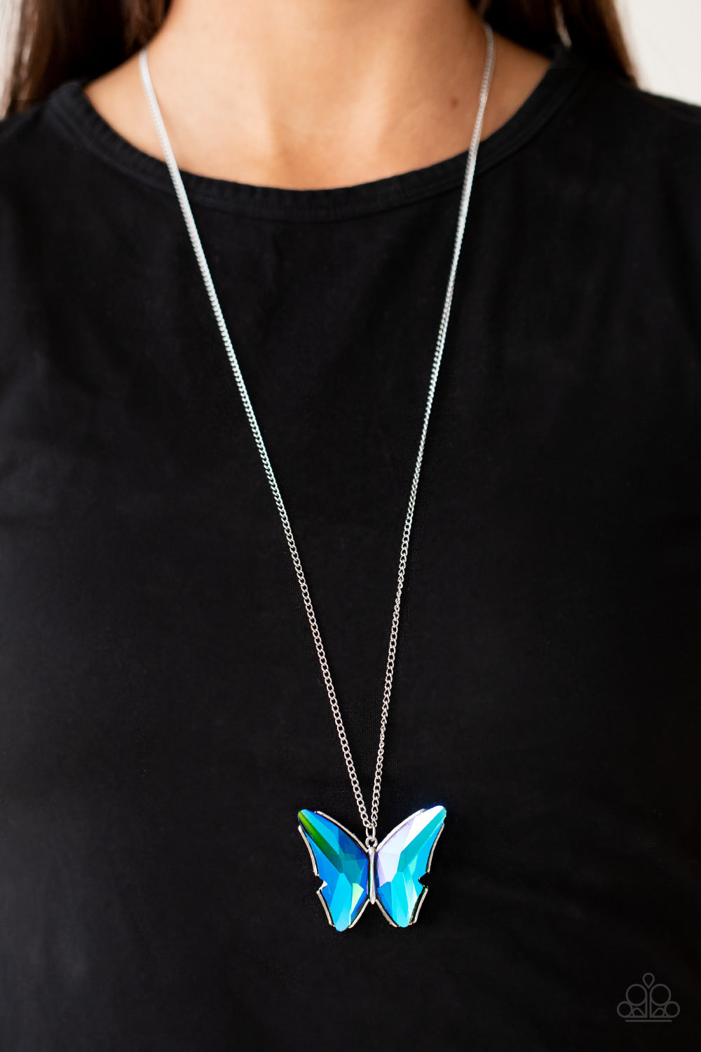 Featuring a UV effect, dramatically faceted blue and green gems adorn the wings of a silver butterfly, creating an ethereal pendant at the bottom of a lengthened silver chain. Features an adjustable clasp closure.