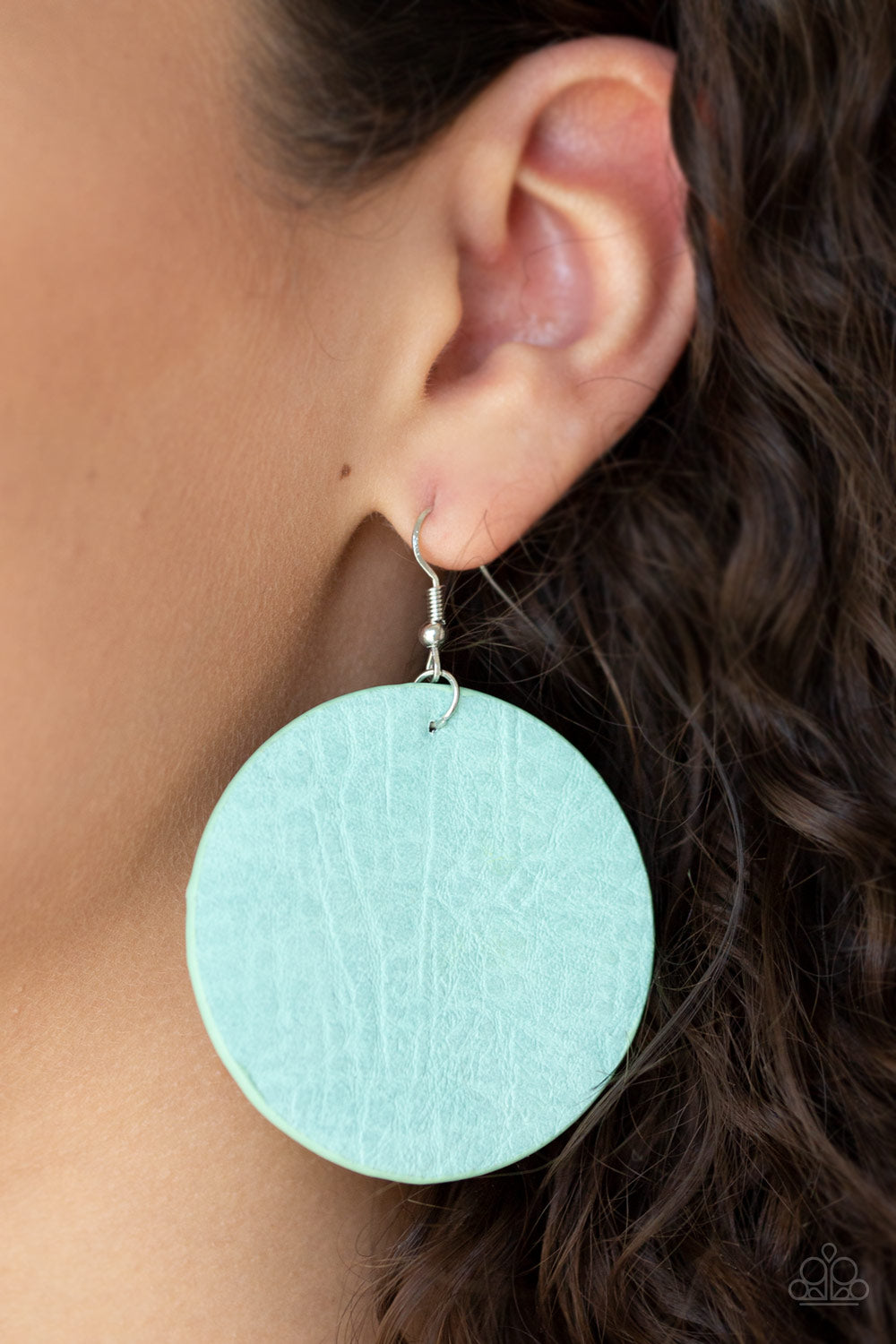 Featuring a textured finish, a refreshing green leather frame swings from the ear for a trendy look. Earring attaches to a standard fishhook fitting.