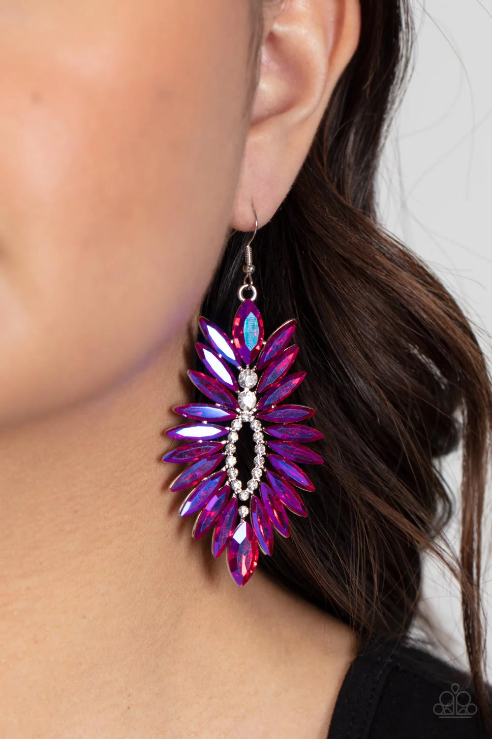 An explosion of iridescent pink marquise rhinestones flares out from a ring of dainty white rhinestones, coalescing into an irresistibly icy statement piece. Earring attaches to a standard fishhook fitting.