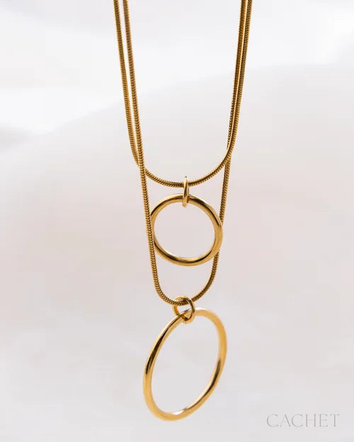Like a luminous connection, the necklace “Union” joins two gleaming circle pendants along delicate chains, their intertwined forms reflecting balance and harmony.