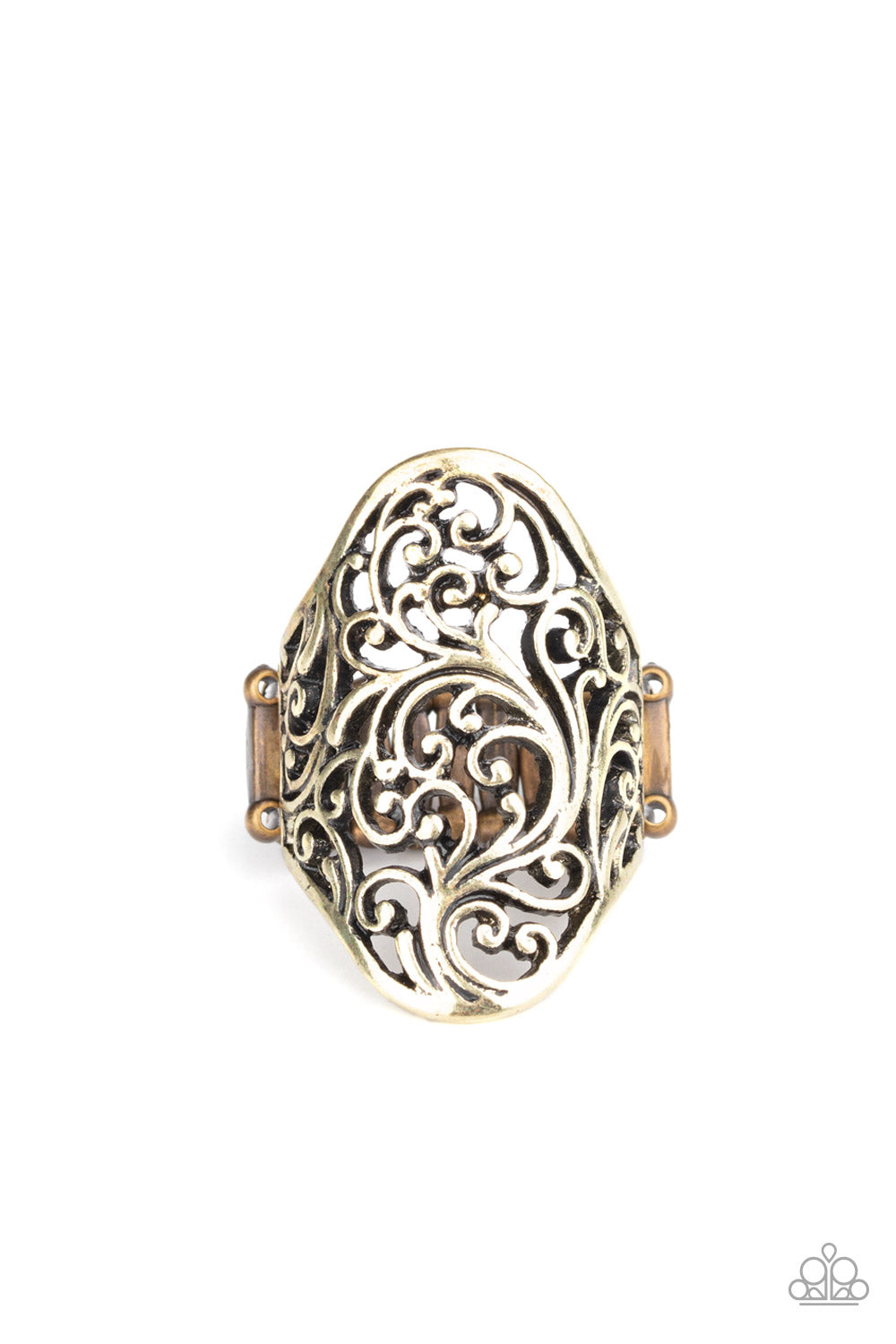 Brushed in an antiqued shimmer, brass vine-like filigree branches across the finger for an airy look. Features a stretchy band for a flexible fit.